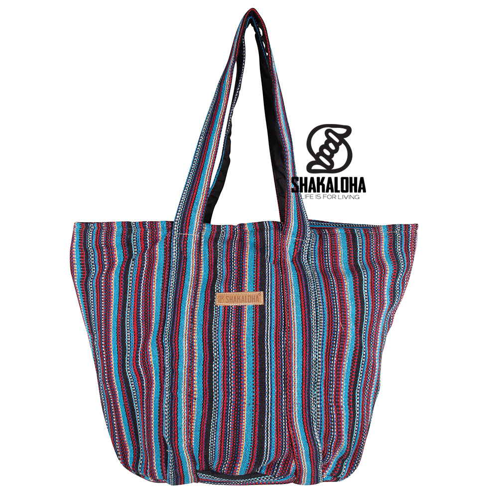 Große Strandtasche aus starker Baumwolle mit vertikalen Streifen in leuchtenden Farben, gefüttert mit schwarzer Baumwolle mit Innentasche. Das Material heißt "Nepali Gherry" und wird lokal in kleinen Fabriken in Nepal gewebt, reine Handarbeit. Der Farbcode dieser Tasche lautet AA03. Die auffällige Hüfttasche wird durch den durchgehenden Reißverschluss oben an der Tasche verschlossen.