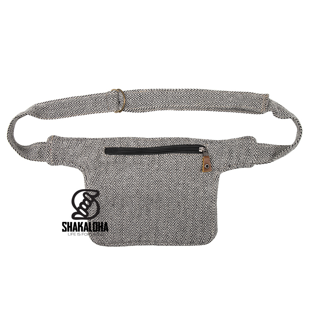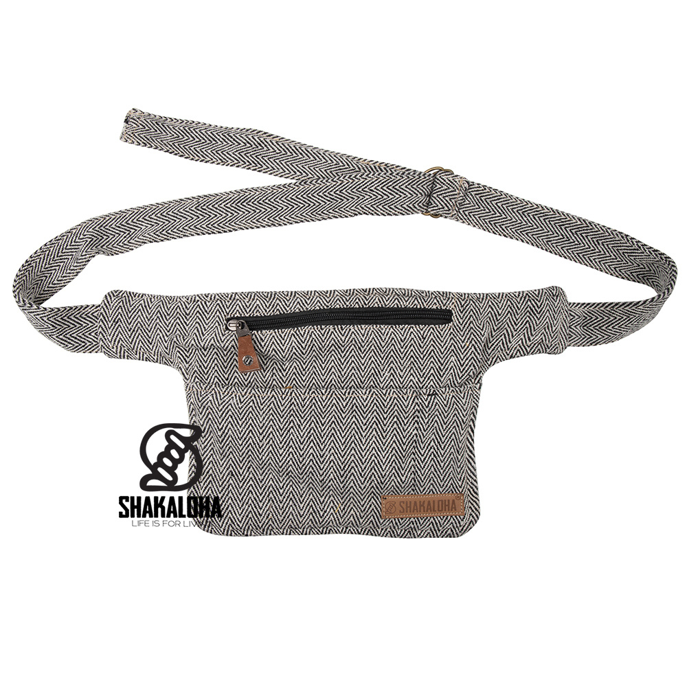 Einzigartige Shakaloha-Gürteltasche mit Reißverschlüssen vorne und hinten mit schwarz / beigem Zickzackmuster. Aus Baumwolle und Hanf. Ideal für Festivals, Reisen und Spaziergänge. In vielen verschiedenen Farben erhältlich.