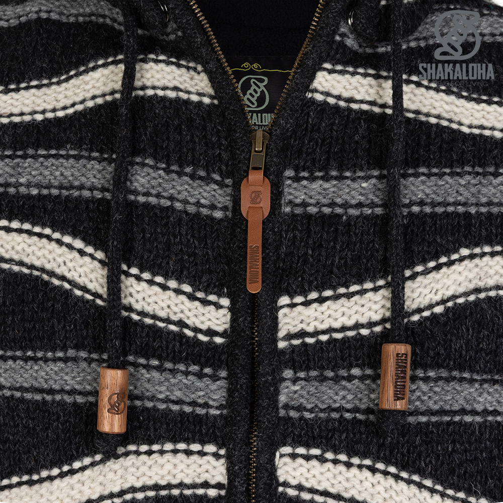 Außen: handgestrickte Schurwolle Voll fleecegefüttert YKK Frontzip Abnehmbare Kapuze mit Kordeln & Holzstoppern 2 Eingrifftaschen Rippbündchen, Regular Fit Farbe: Grau Handgefertigt in Nepal Pflege: Wollwaschgang kalt (bis 30°C); liegend trocknen.