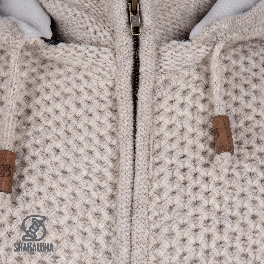 Beschreibung Shakaloha Strick-Wollweste Maverick ZH Beige Creme mit Fleecefutter und abnehmbarer Kapuze – Herren/Uni – Handgefertigt in Nepal aus Schafwolle