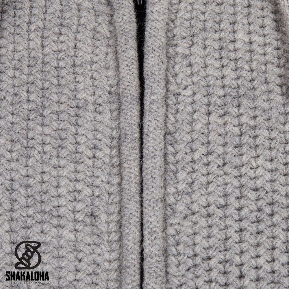 Beschreibung Shakaloha Strick-Wollweste Maverick ZH Grau mit Fleecefutter und abnehmbarer Kapuze – Herren/Uni – Handgefertigt in Nepal aus Schafwolle