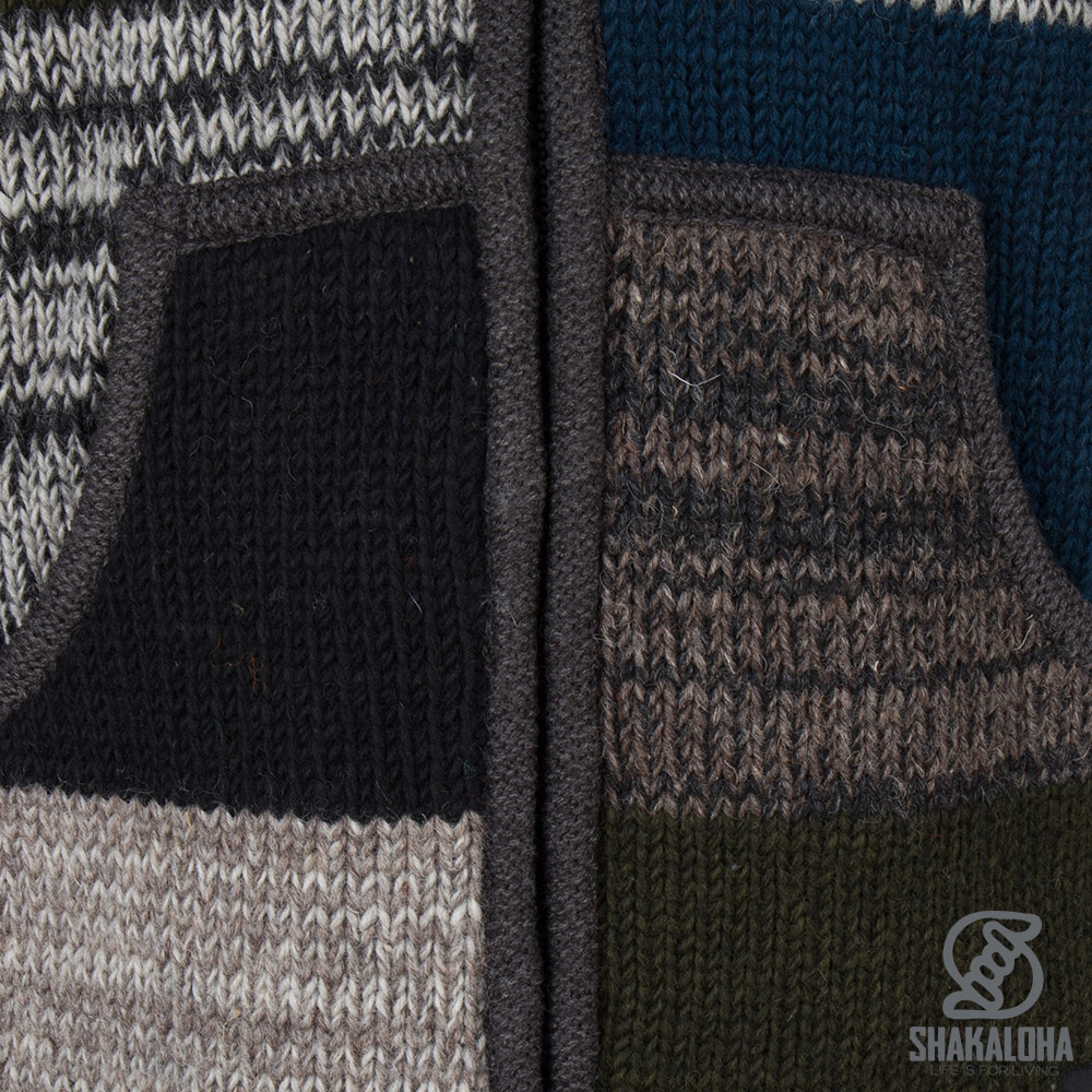 Diese farbenfrohe Herrenweste aus Patchwork-Wolle besteht aus verschiedenen Farben und gemusterten Oberflächen und verfügt über einen Innenkragen, eine abzippbare Kapuze, Känguru-Taschen und eine abschließbare Innentasche. Diese beliebte Strickjacke von Shakaloha ist am Körper, an den Ärmeln, den Taschen sowie am Kragen und an der Kapuze mit warmem Fleece gefüttert. Die Weste besteht aus bunten Farben und Oberflächen mit natürlichen Farben. Diese Weste ist in den auf dem Foto gezeigten Farben erhältlich, die Positionen unterscheiden sich jedoch je nach Weste. Diese warme Strickjacke kann im Winter als Jacke getragen werden, ist aber auch an kühlen Sommertagen sehr bequem. Erhältlich in verschiedenen Farbkombinationen und in den Größen S bis 3XL. Die Shakaloha-Jacken bestehen aus 100% neuseeländischer Schafwolle und werden in Nepal mit Rücksicht auf Tiere und Angestellte hergestellt. Die Strickjacken können mit einem 30-Grad-Wollwaschprogramm mit etwas Wollwaschmittel gewaschen werden.