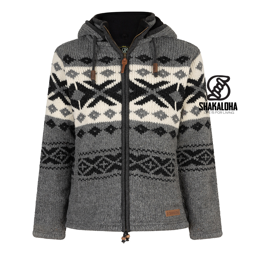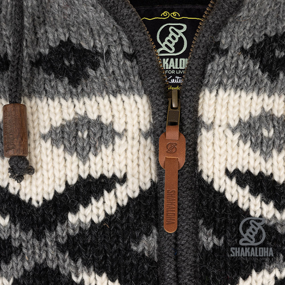 Klassischer Herren-Cardigan aus Wolle, einfarbig oder mit Fleecefutter. Mit Norwegermuster in Grau, Weiß und Schwarz. Fleecefutter an Rumpf, Taschen und abnehmbarer Kapuze.