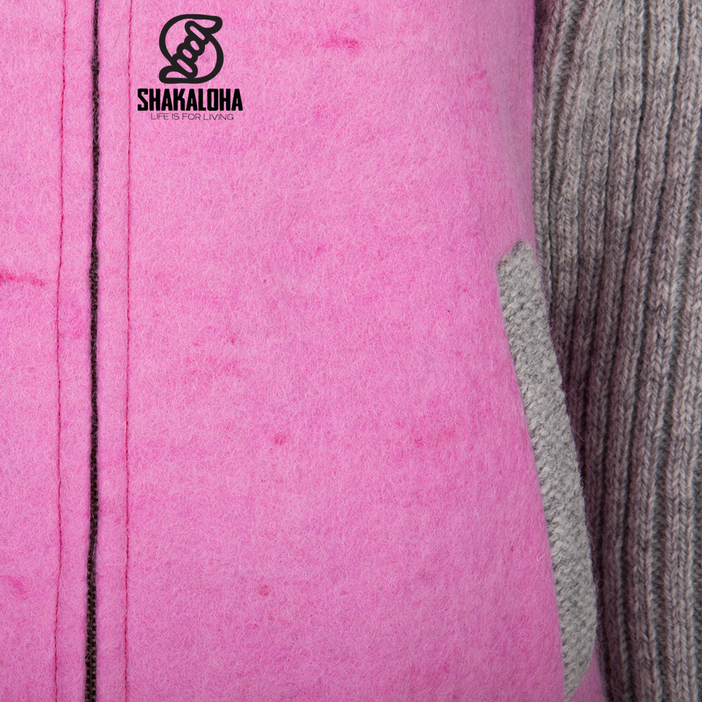 Einzigartige Baseballjacke aus rosafarbenem Filz und einem grobgrauen Strickstich, komplett aus 100% Schafwolle. Der Körper besteht aus marineblauem Filz und die Ärmel, der Kragen und die Kapuze sind grau und klobig. * Seitentaschen * YKK-Reißverschlüsse * abschließbare Innentasche * komplett mit 100% baumwolle gefüttert * abnehmbare Kapuze * Erhältlich in den Größen S bis XL Die Shakaloha-Jacken bestehen aus 100% neuseeländischer Schafwolle und werden in Nepal mit Rücksicht auf Tiere und Angestellte hergestellt. Die Strickjacken können mit einem 30-Grad-Wollwaschprogramm mit etwas Wollwaschmittel gewaschen werden.