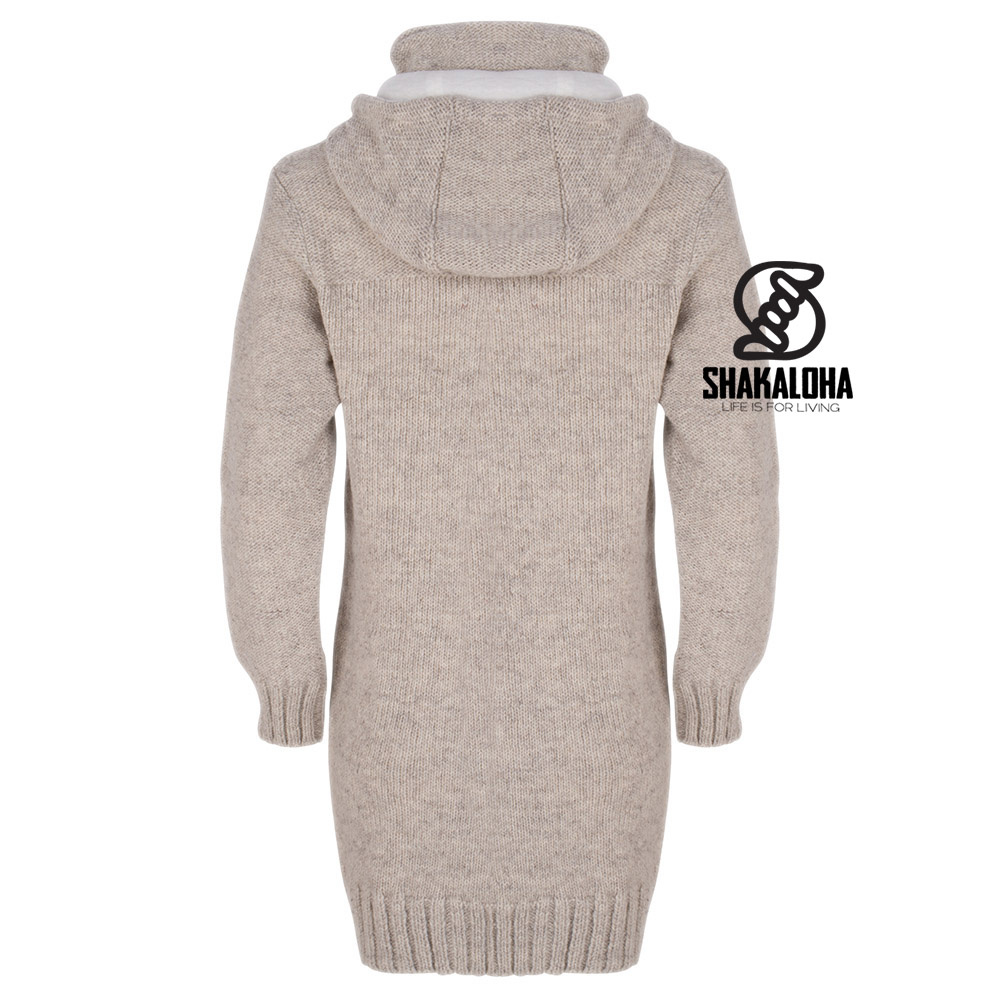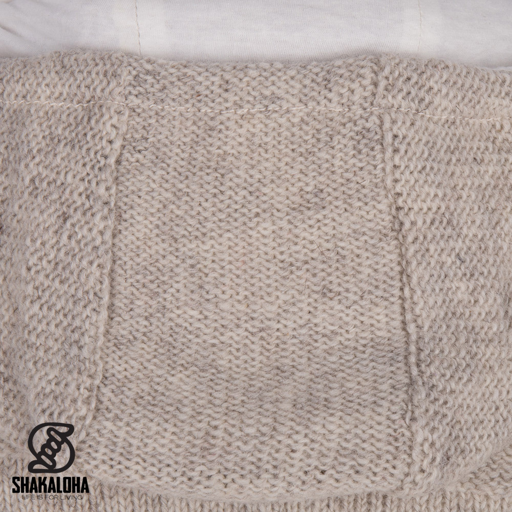 Schöne lange beige Damen Strickjacke mit abnehmbarer Kapuze. Die Jacke ist komplett mit warmem und weichem Fleece gefüttert, auch an Ärmeln, Kapuze, Taschen und Ärmeln. Die Weste hat Seitentaschen und eine Innentasche mit Reißverschluss. Am Hauptreißverschluss und an den Bündchen wurde ein vertikaler Strickstich verwendet, wodurch ein einzigartiger Cardigan entsteht. Diese Jacke ist in den Farben Anthrazit, Hellbraun, Beige und Grau in den Größen S bis 3XL erhältlich. Die Shakaloha-Westen bestehen aus 100% neuseeländischer Schafwolle und werden in Nepal mit Respekt für Tiere und Mitarbeiter hergestellt. Die Strickjacken können mit etwas Wollwaschmittel im 30 Grad Wollwaschprogramm gewaschen werden.