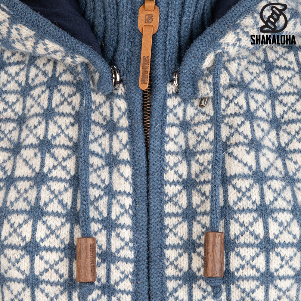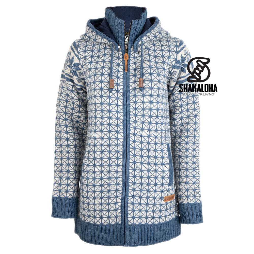 Eiskristall-Strickmotiv in mittellanger Damen-Strickjacke mit Baumwollfutter in Weiß und Blau gestrickt. Abnehmbare Kapuze und starker YKK-Reißverschluss auf der Vorderseite. Ein wunderschöner Damen-Cardigan aus 100 % Wolle für alle Jahreszeiten.