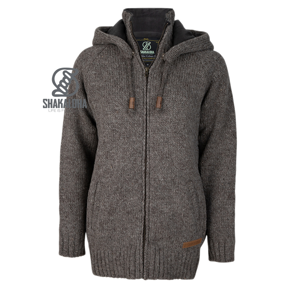 Shakaloha Gestrickte Wollweste Gin Ziphood mit Fleecefutter und abnehmbarer Kapuze – Damen – Handgefertigt in Nepal aus Schafwolle