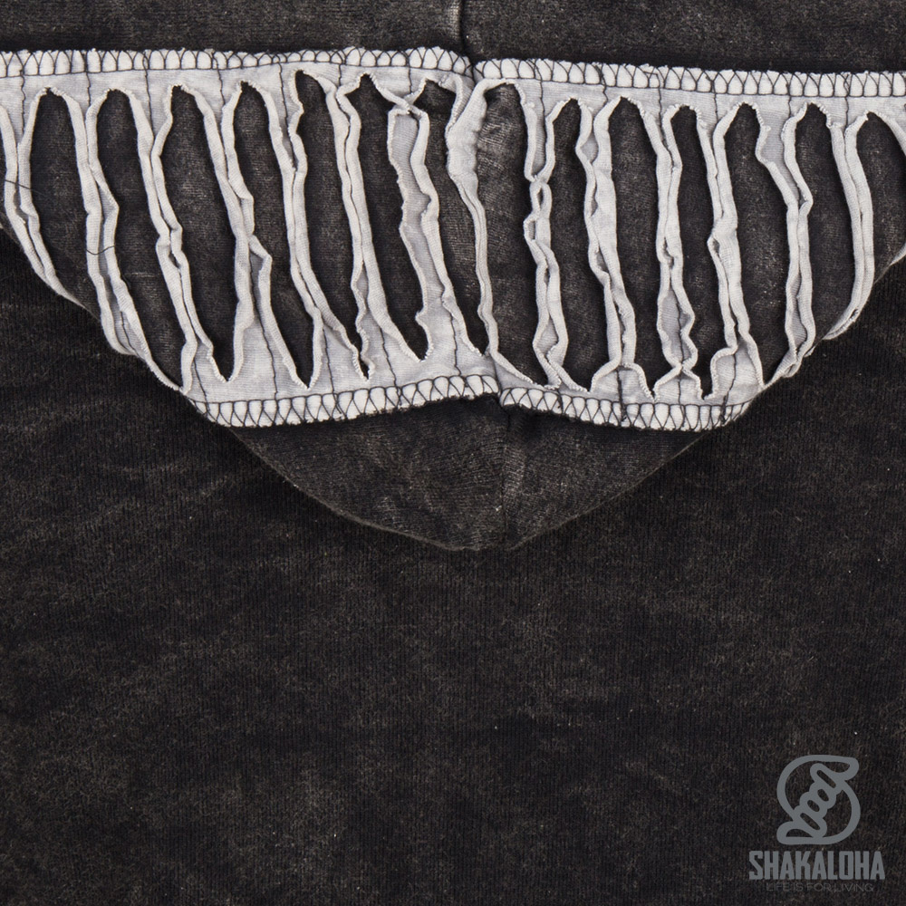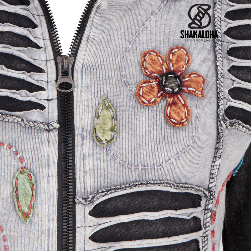 Beige mit anthrazitfarbener Shakaloha-Jacke mit verspielten Details mit Blumen und Herzen. Diese Jacke fällt bis zur Hüfte und ist mit hellem Fleece gefüttert. Die Jacke hat Seitentaschen, einen starken Reißverschluss und eine Kapuze. Alle Shakaloha-Produkte werden unter Berücksichtigung von Mensch und Tier hergestellt.
