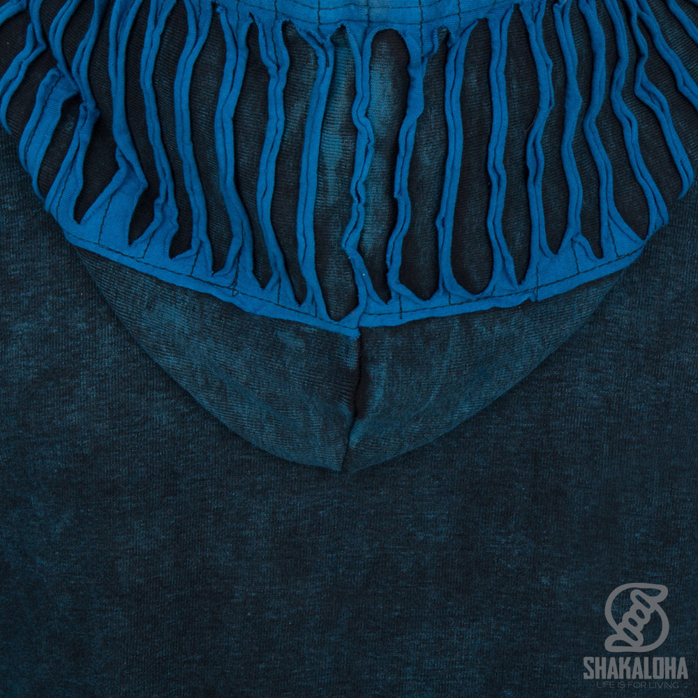 Blaue Shakaloha-Jeansjacke mit verspielten Details in Mittelblau mit Blumen und Herzen. Diese Jacke fällt bis zur Hüfte und ist mit hellem, weichem Fleece gefüttert. Die Jacke hat Seitentaschen, einen starken Reißverschluss und eine Kapuze. Hergestellt in Nepal mit Respekt vor Menschen und Tieren.