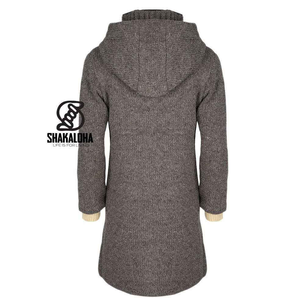 Hellbraune, extra lange Wolljacke mit vollem Fleecefutter, abnehmbarer Kapuze und einer Kombination aus Holzschnur und starkem YKK-Reißverschluss. Die Strickjacke hat auch eine Innentasche mit Reißverschluss und eine braune Innenhülle. Diese bequeme Strickjacke besteht aus 100% Schafwolle und ist für alle Jahreszeiten schön warm. Der Whistler ist in den Größen S-XXL in der Farbe Anthrazit oder Beige erhältlich. Die Shakaloha-Jacken bestehen aus 100% neuseeländischer Schafwolle und werden in Nepal unter Berücksichtigung von Tieren und Mitarbeitern hergestellt. Die Strickjacken können mit einem kleinen Wollwaschmittel in einem 30-Grad-Wollwaschprogramm gewaschen werden.
