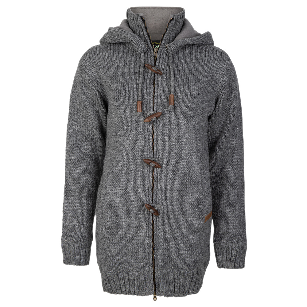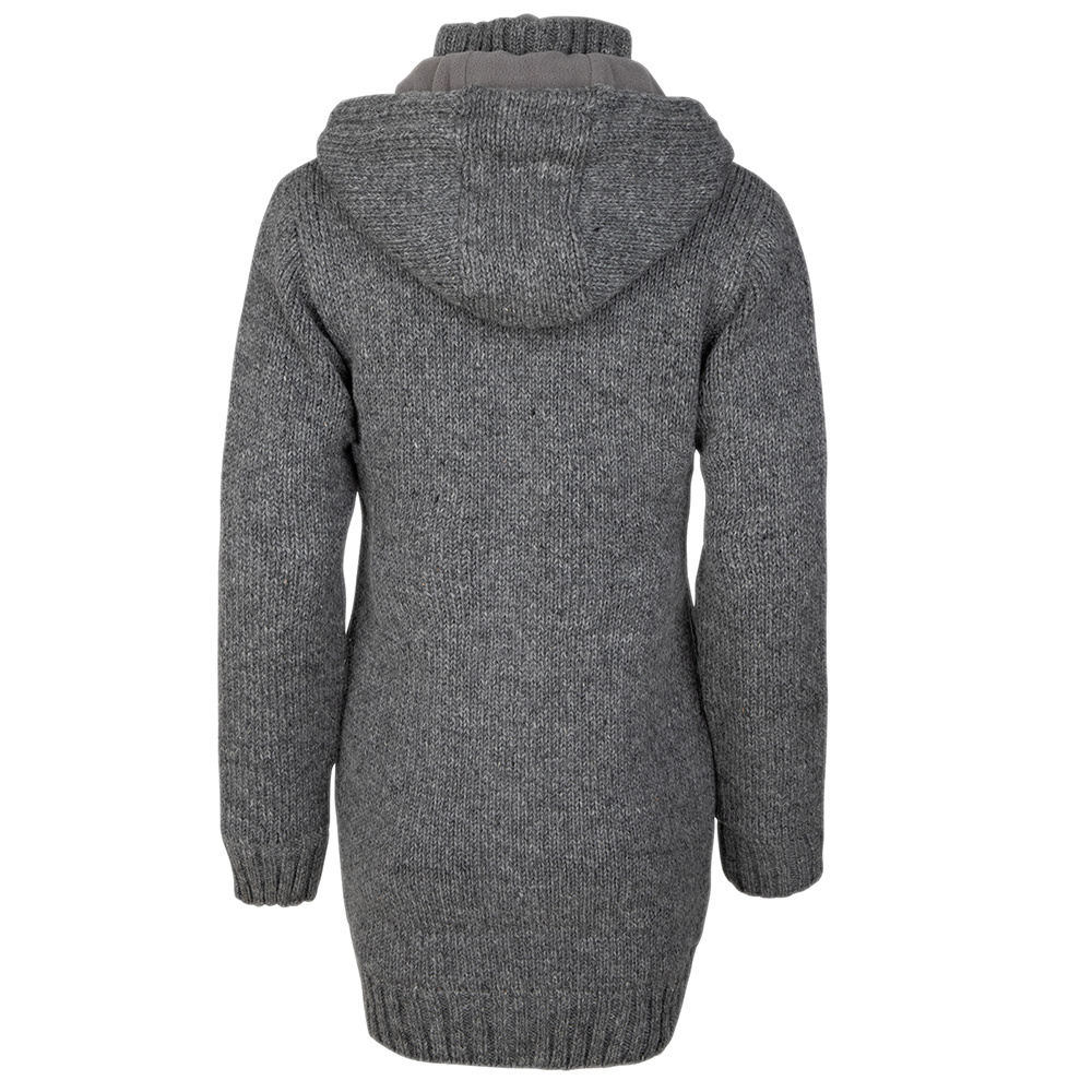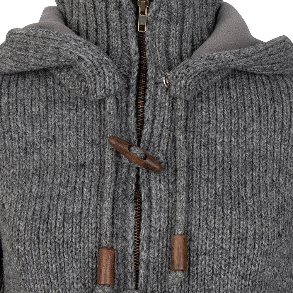 Herrlich warmer langer Damen-Cardigan in der Farbe Hellgrau mit Reißverschluss und Holzkordelverschluss. Sowohl der untere Teil der Strickjacke als auch die Ärmel haben eine vertikal gestrickte Bordüre. Die Jacke hat Seitentaschen, einen hohen Kragen und eine abnehmbare Kapuze, eine Innentasche und ist komplett mit warmem Fleece gefüttert, damit die Wolle nicht auf der Haut kitzelt und die Unterwäsche nicht flauschig wird. Der Zwei-Wege-YKK-Reißverschluss ist sehr stark und super praktisch, die Weste kann von unten geöffnet werden, während sie von oben befestigt wird. Diese warme Strickjacke kann im Winter als Jacke getragen werden, ist aber auch an kühlen Sommertagen sehr bequem und in den Farben Anthrazit und Beige in den Größen S bis XXL erhältlich. Die Shakaloha-Westen bestehen zu 100 % aus neuseeländischer Schafwolle und werden in Nepal mit Respekt vor Tieren und Mitarbeitern hergestellt. Die Strickjacken können mit etwas Wollwaschmittel bei 30 Grad Wollwaschgang gewaschen werden.
