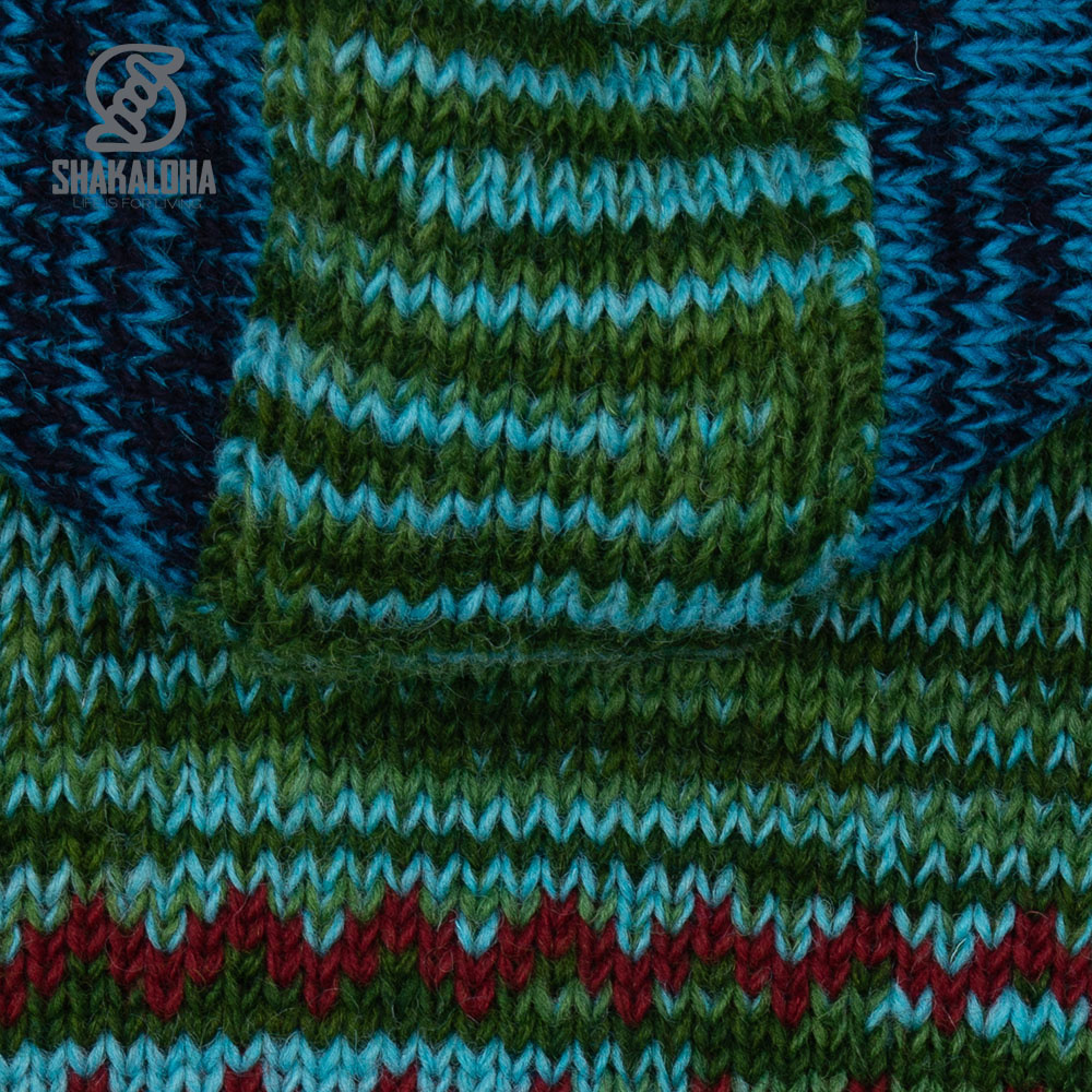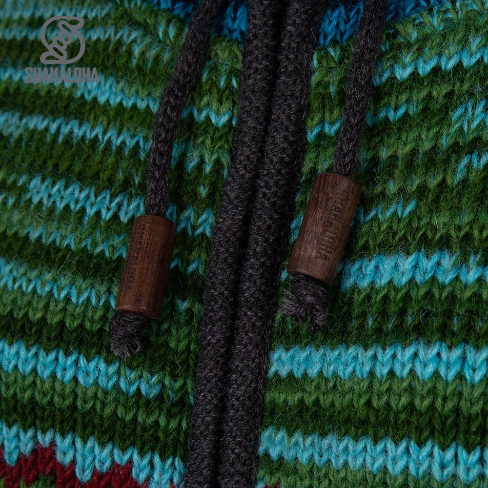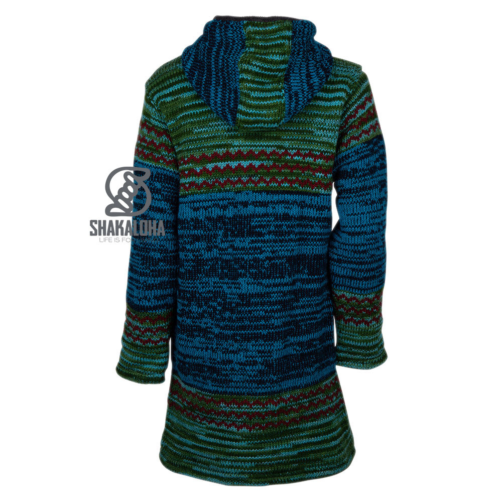 Long woolen women's cardigan with different colors of green, blue and an anthracite trim. The cardigan has a hood and is fully lined with warm fleece and comes in length between hip and knee. Nice side pockets and inside pocket with zipper. This cardigan is available in many different color combinations in sizes S to 3XL. The Shakaloha vests are made of 100% New Zealand sheep wool and are made in Nepal with respect for animals and employees. The cardigans can be washed with a little wool detergent on a 30 degree wool wash program.