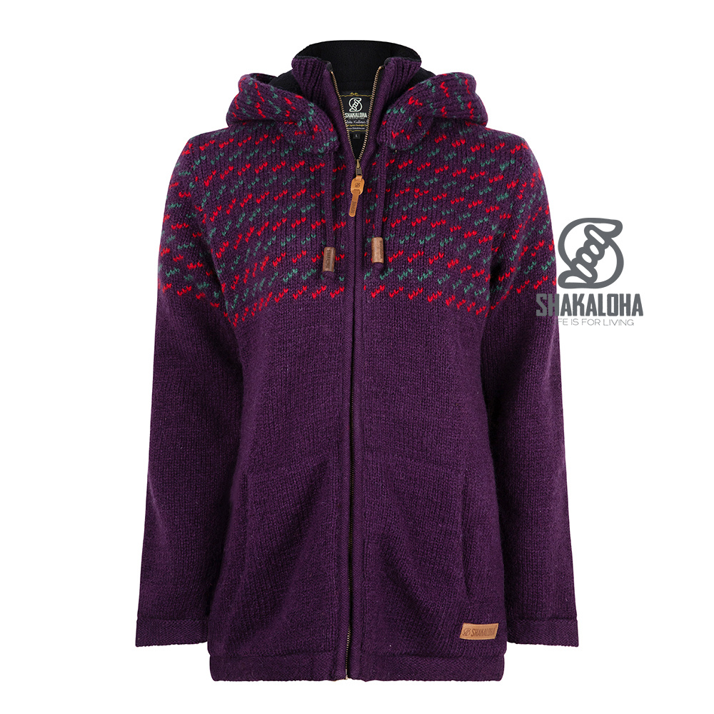 Purple mid-length ladies knitted wool cardigan with teddy fleece lining. This unique vest has a removable hood with a zipper, a fleece-lined kangeroo pocket on the front and a lockable inner pocket on the inside left.