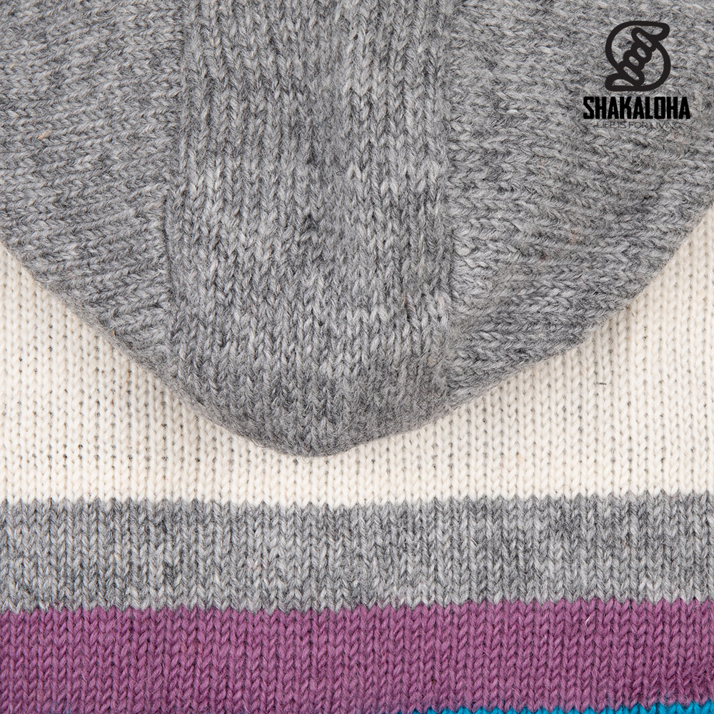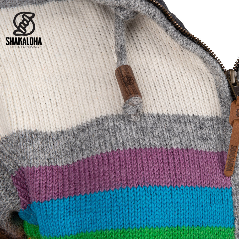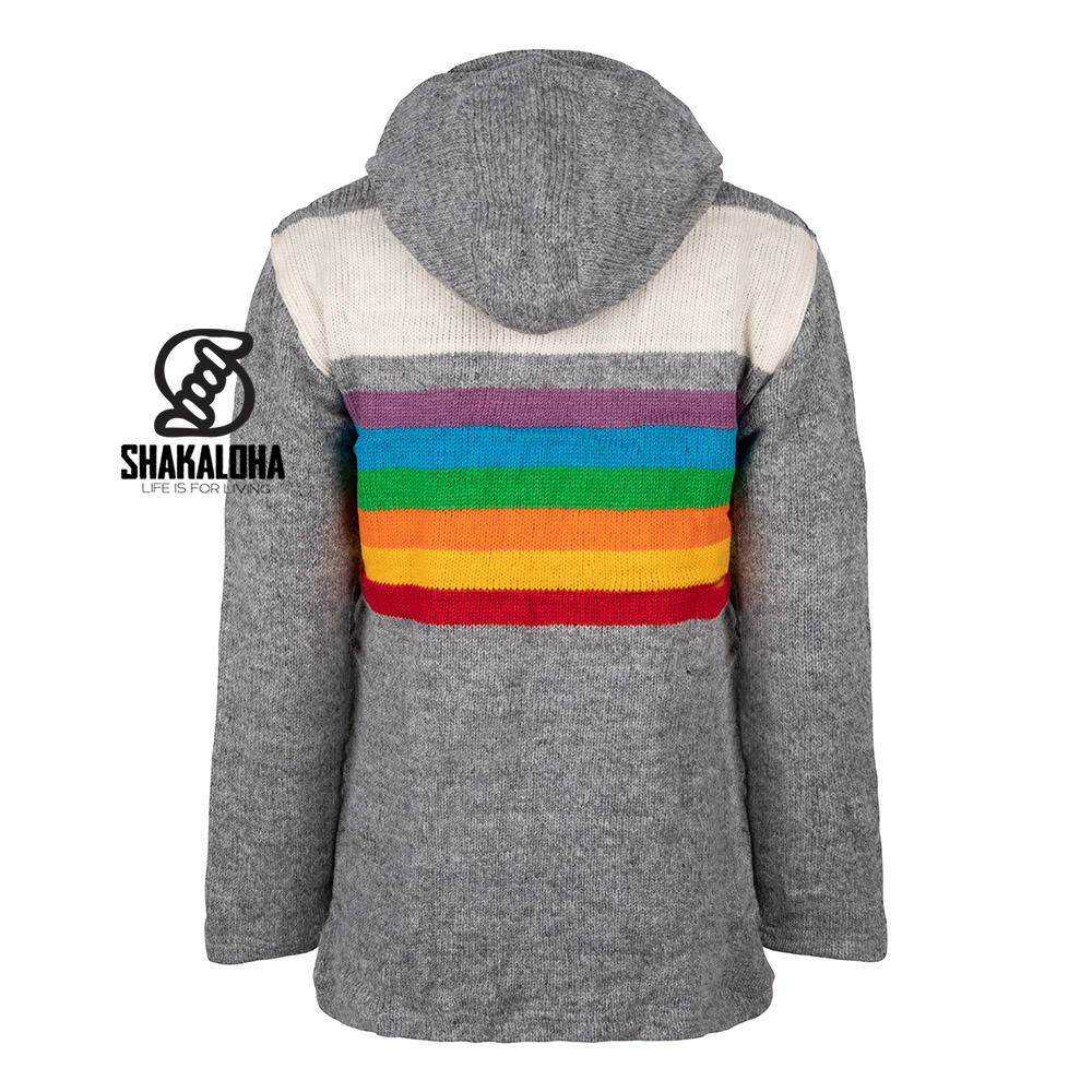 Knitted gray woolen ladies jacket with rainbow colors and fleece inner lining, detachable hood, side pockets and a strong zipper. With on the front and back a track with rainbow colors surmounted by a beige surface.