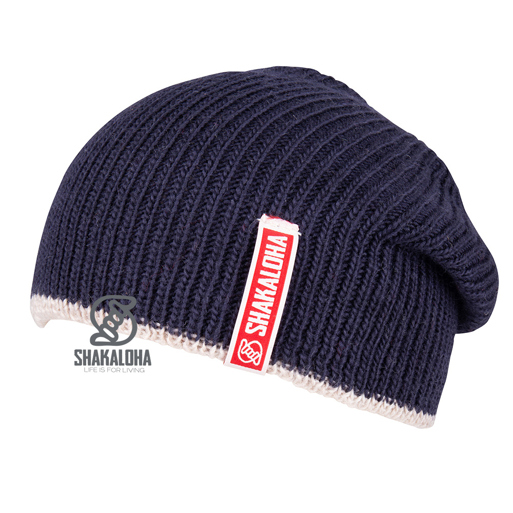 Gorro de lana merino de Shakaloha, reversible, por lo que se puede usar por ambos lados, exterior azul marino, interior beige.