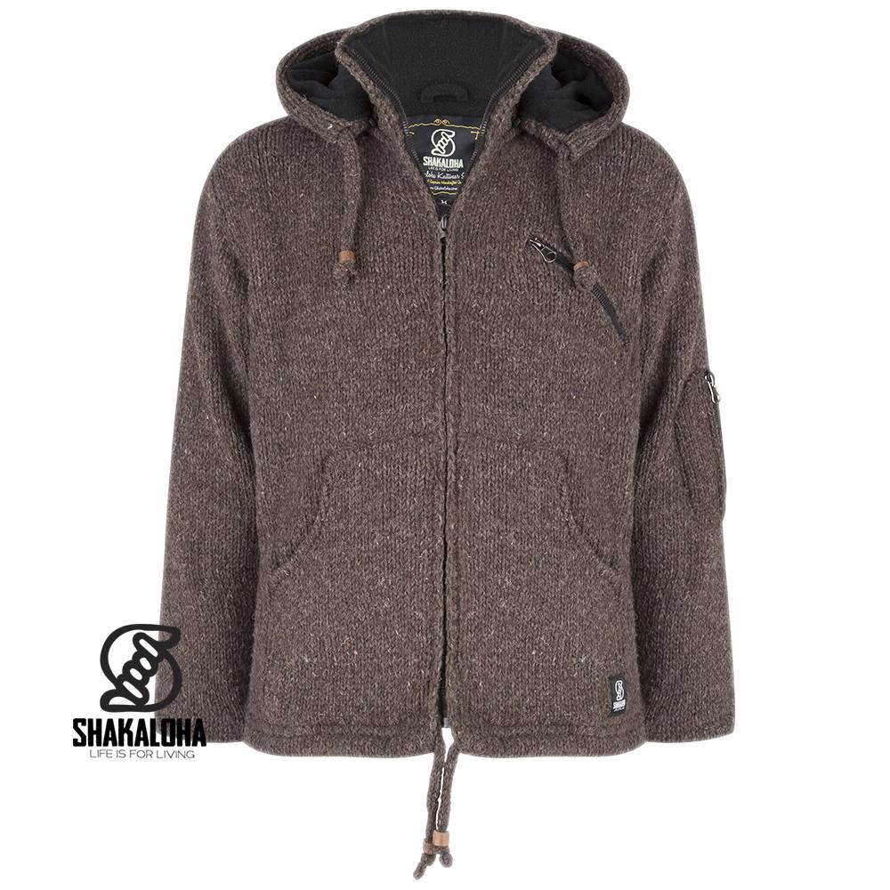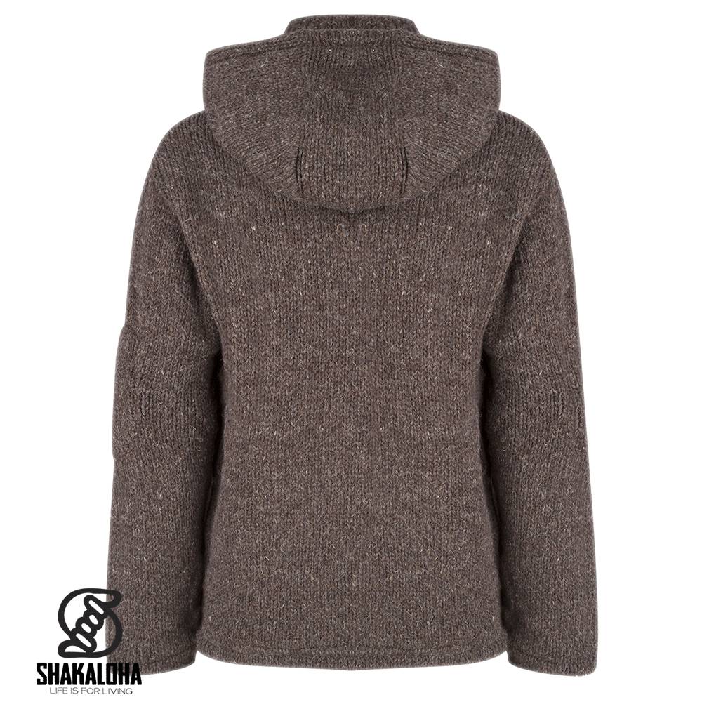 Chaleco de punto de lana Shakaloha con capucha y cremallera, color marrón oscuro, forro polar y capucha desmontable - Hombre/Unisex - Hecho a mano en Nepal con lana de oveja