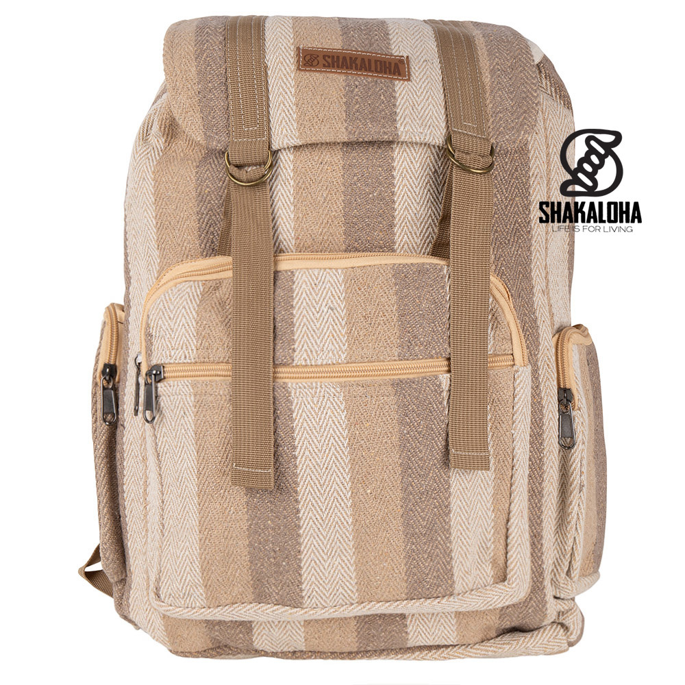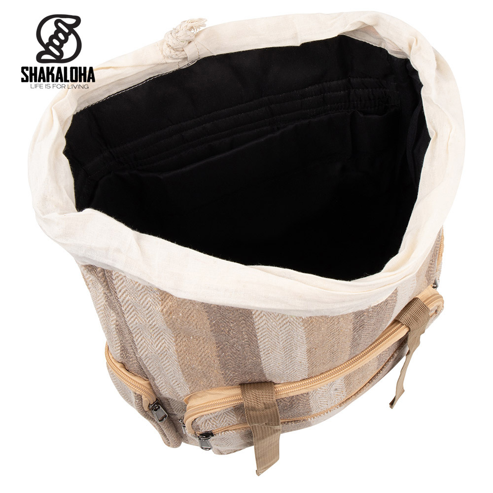 Mochila mediana de algodón Shakaloha. Mochila con varios compartimentos con cremallera y espacio para un portátil de 15 pulgadas. La parte superior se cierra con un cordón y correas. Nota: Esta mochila está disponible en varios diseños de rayas.