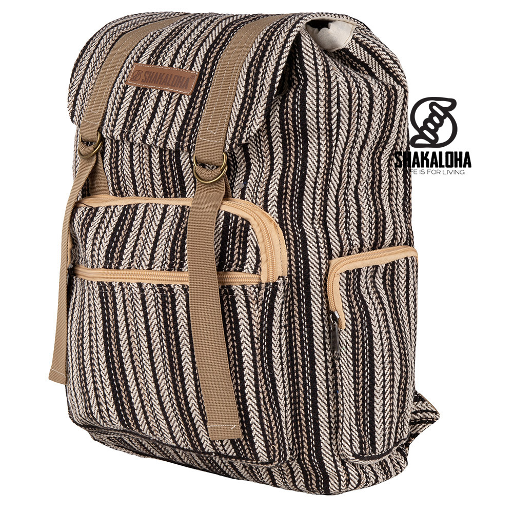 Mochila mediana de algodón Shakaloha. Mochila con varios compartimentos con cremallera y espacio para un portátil de 15 pulgadas. La parte superior se cierra con un cordón y correas. Nota: Esta mochila está disponible en varios diseños de rayas.