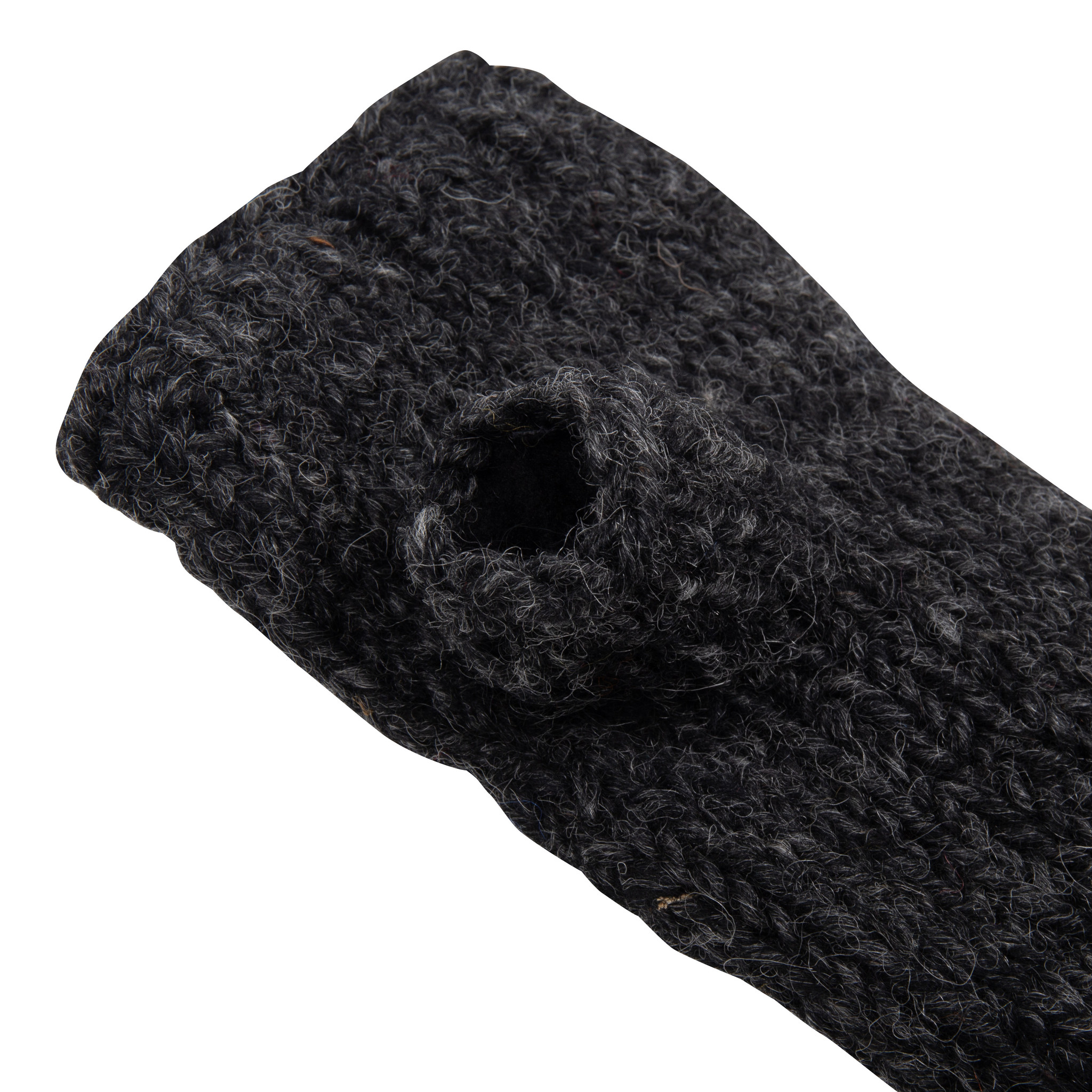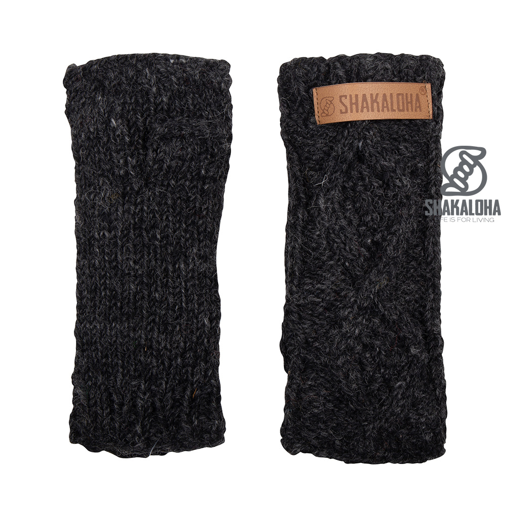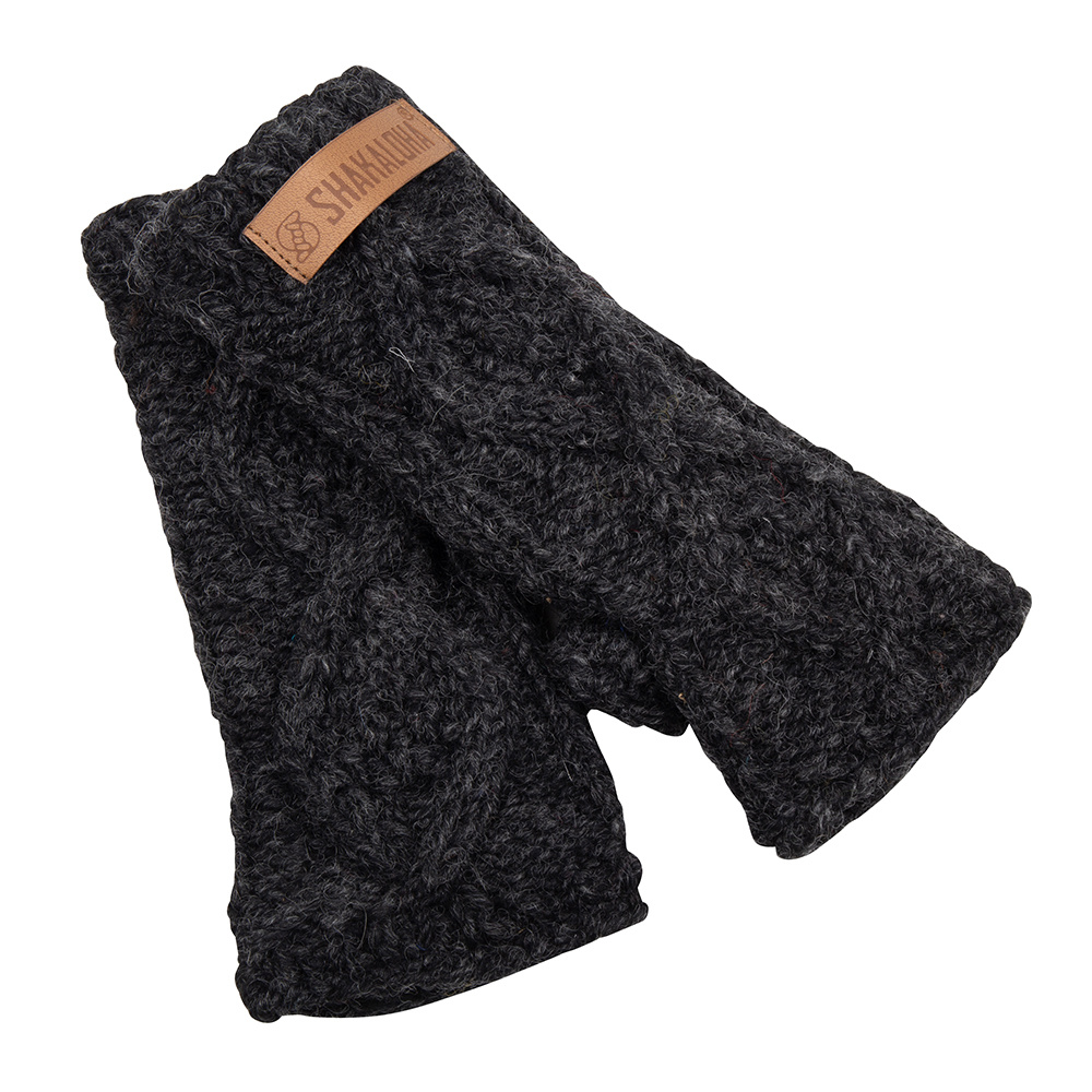 Calentador de manos de lana Shakaloha con forro polar, con un divertido patrón de tejido. Disponible en dos tallas y dos colores: antracita y beige. Los guantes se tejen a mano en Nepal, respetando tanto a las personas como a los animales.