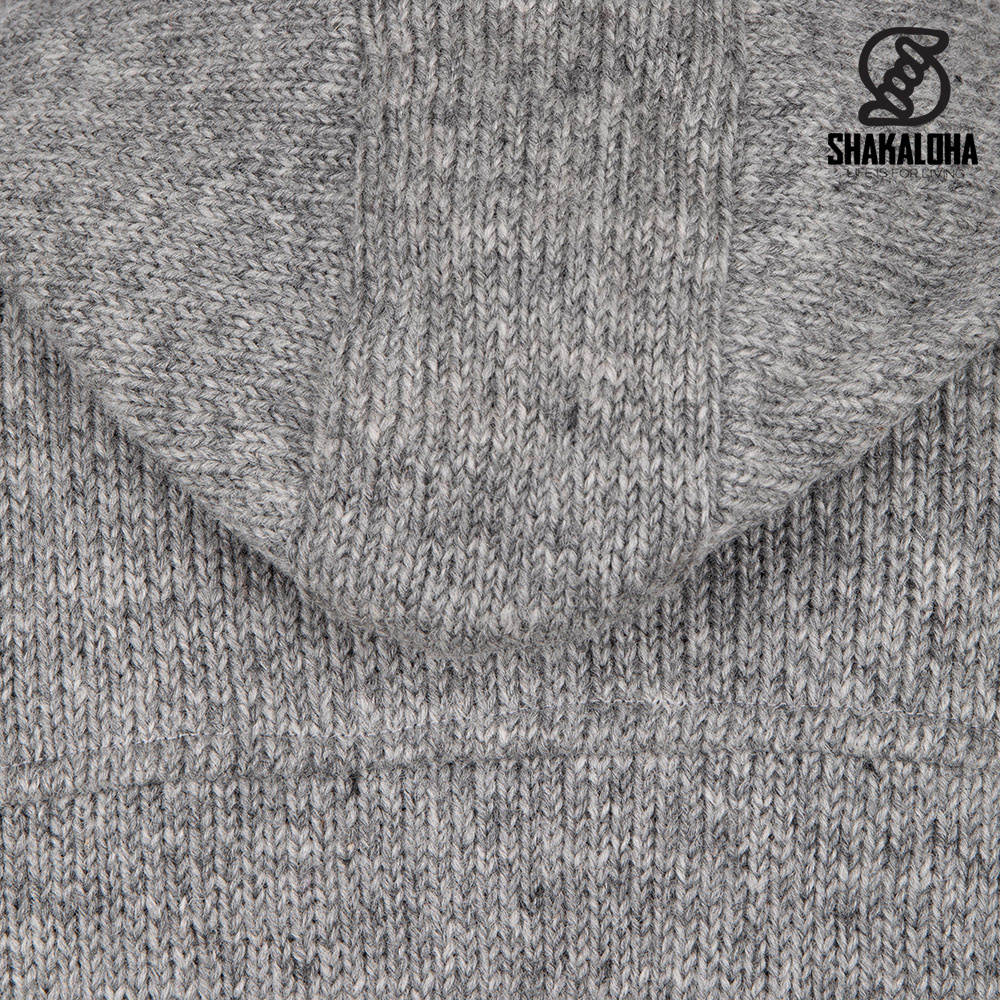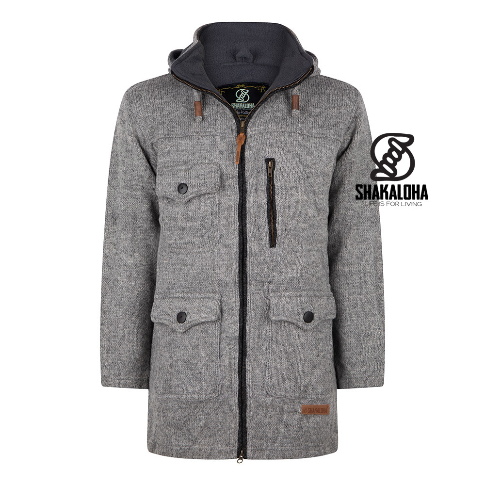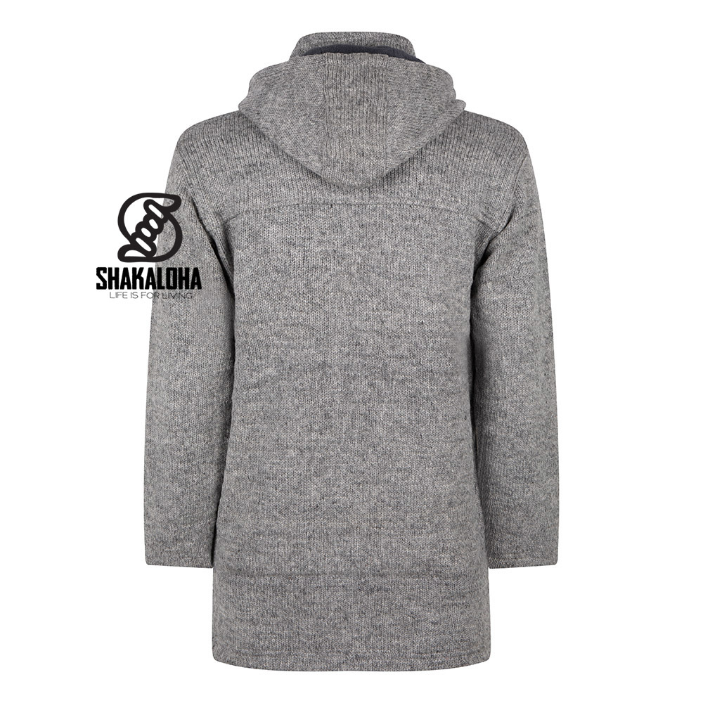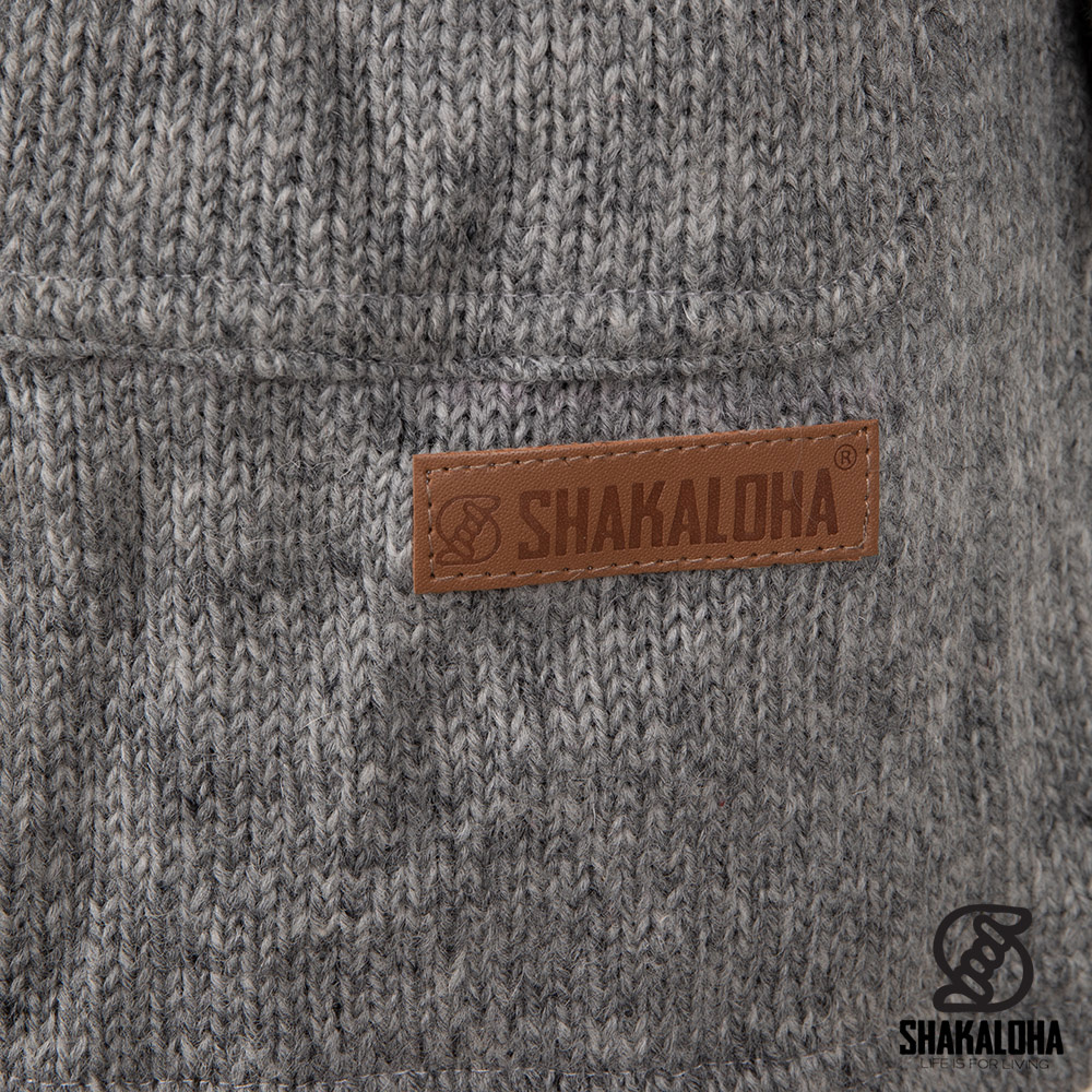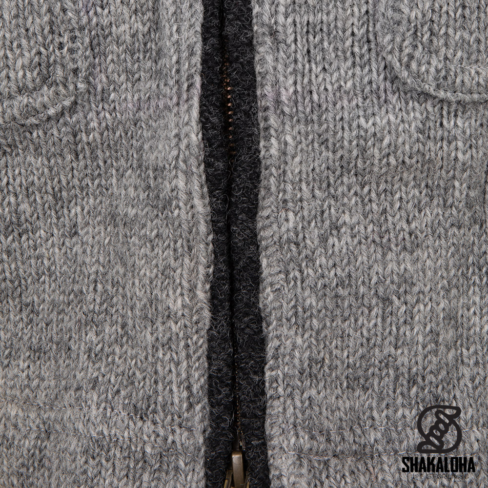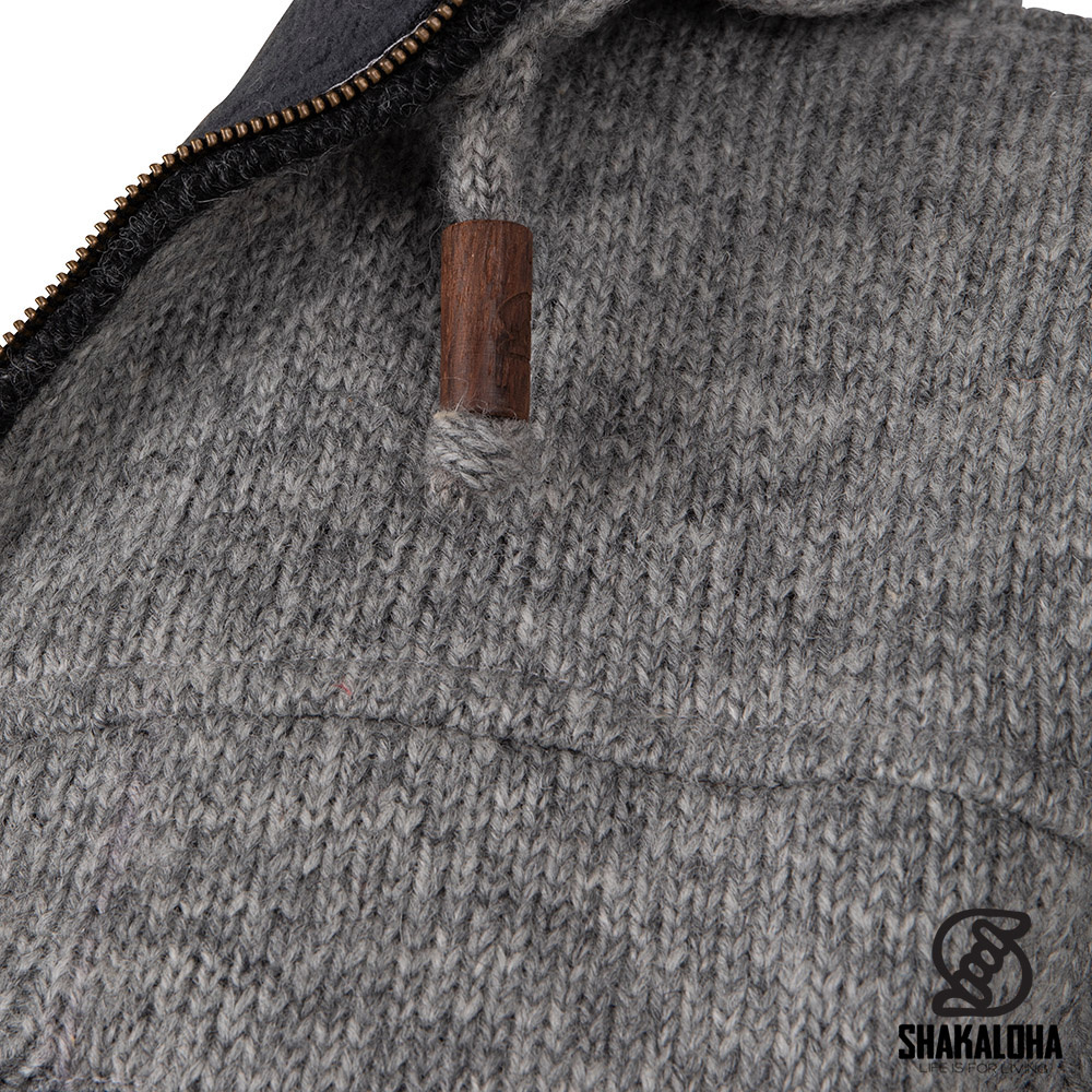 Chaqueta gris de punto de lana para hombre con numerosos bolsillos, tres con solapas abotonadas y uno con cremallera. El chaleco llega hasta la cadera y está completamente forrado con un forro polar cálido y suave, incluyendo las mangas y la capucha desmontable. Una chaqueta que puede usarse como chaleco, abrigo, para actividades al aire libre o para ocasiones formales. Está disponible en tres colores diferentes y tallas de la S a la 3XL. Los chalecos Shakaloha están confeccionados con 100 % lana de oveja de Nueva Zelanda y se fabrican en Nepal respetando tanto a los animales como a los trabajadores. Se pueden lavar con un poco de detergente para lana en un ciclo de 30 grados.