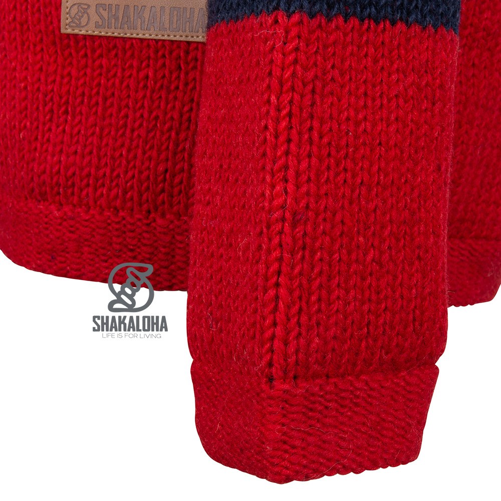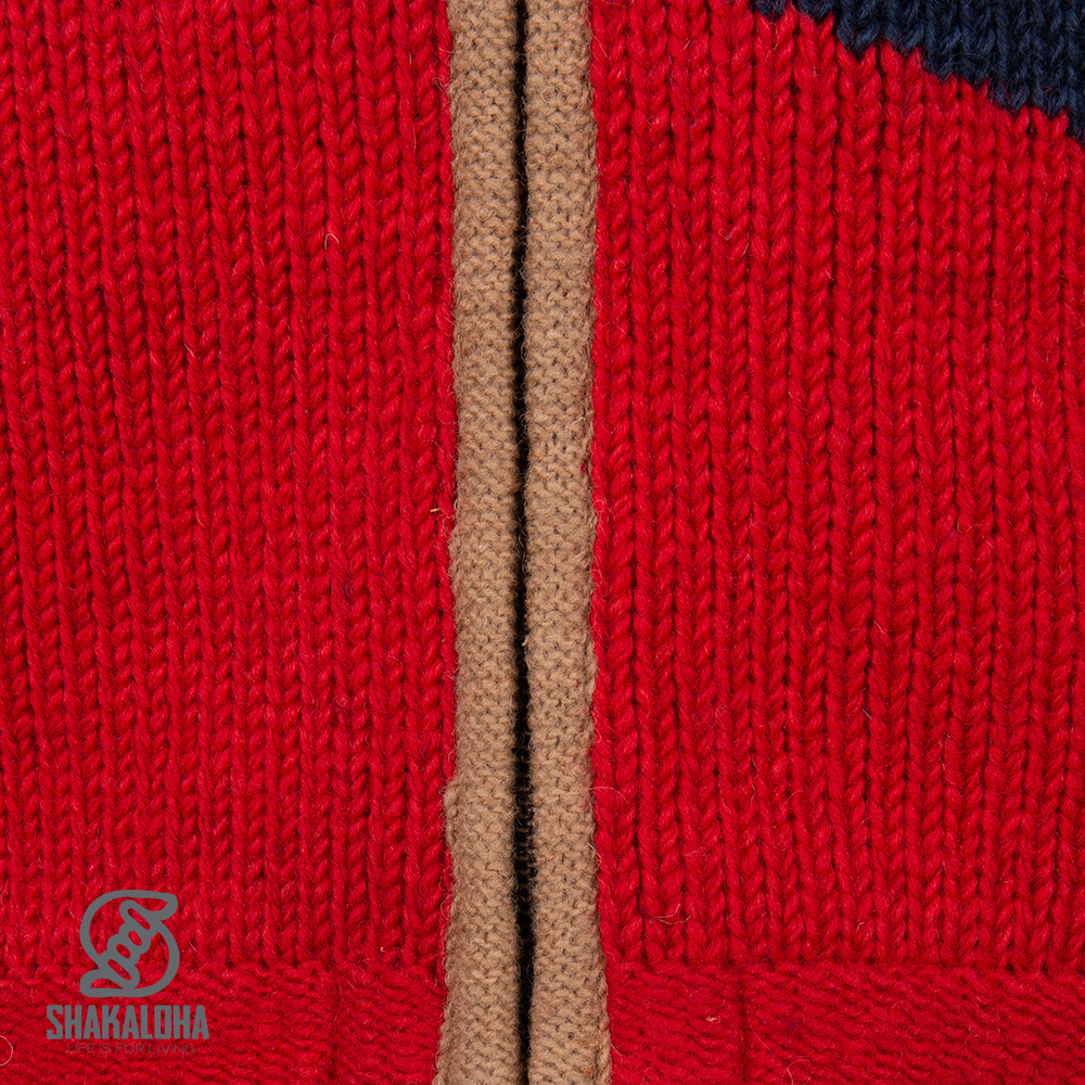 Cárdigan Shakaloha de lana de punto con tres rayas diagonales en beige, azul y rojo. La capucha, mitad negra y mitad beige, es desmontable mediante cordones y un cierre de madera. El cárdigan cuenta con bolsillos laterales y un bolsillo interior con cierre, y está completamente forrado con un suave y cálido forro polar. La chaqueta está disponible en tres colores diferentes y en una amplia gama de tallas. Los cárdigans Shakaloha están confeccionados con 100 % lana de oveja de Nueva Zelanda y se fabrican en Nepal respetando tanto a los animales como a los trabajadores. Se pueden lavar con un poco de detergente para lana en un ciclo de 30 grados.