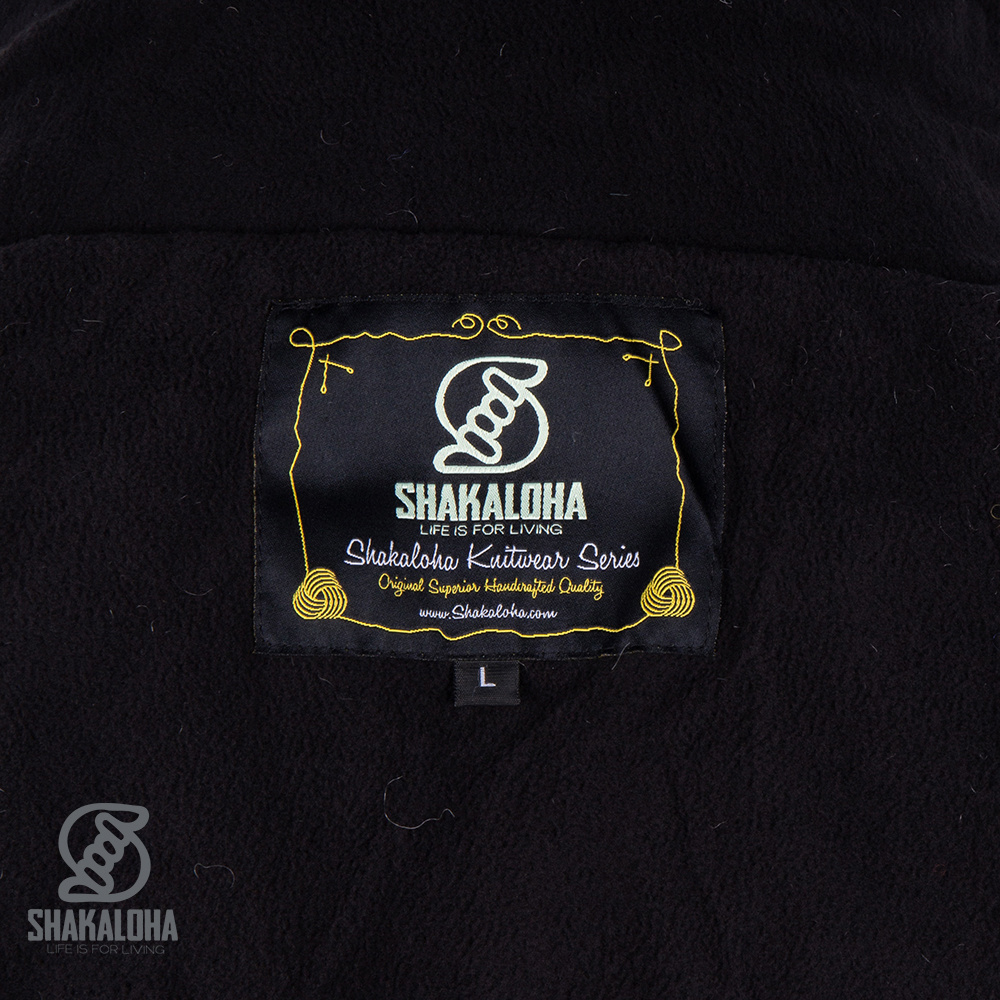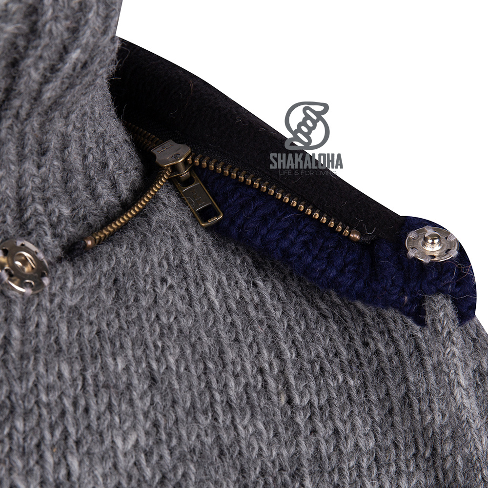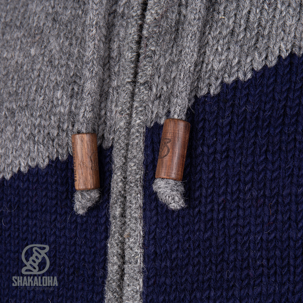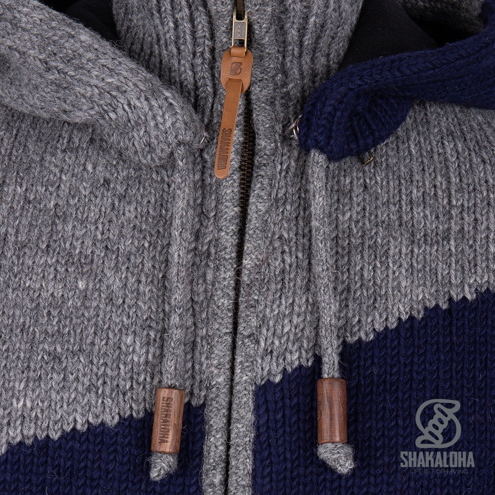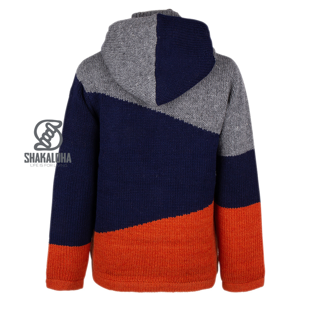 Cárdigan Shakaloha de lana de punto con tres rayas diagonales en gris, azul y naranja. La capucha, mitad negra y mitad beige, es desmontable mediante cordones y un cierre de madera. El cárdigan cuenta con bolsillos laterales y un bolsillo interior con cierre, y está completamente forrado con un suave y cálido forro polar. La chaqueta está disponible en tres colores diferentes y en una amplia gama de tallas. Los cárdigans Shakaloha están confeccionados 100 % con lana de oveja de Nueva Zelanda y se fabrican en Nepal respetando tanto a los animales como a los trabajadores. Se pueden lavar con un poco de detergente para lana en un ciclo de 30 grados.