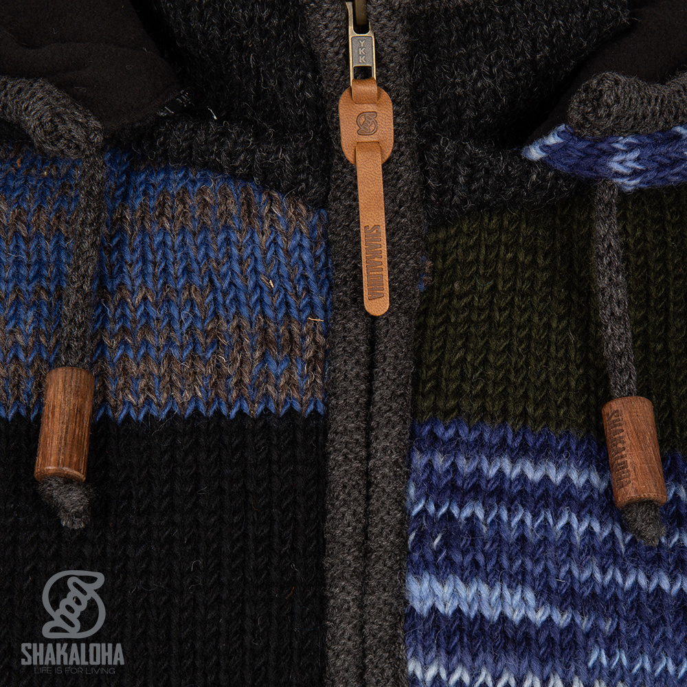 Cárdigan de lana para hombre con forro polar. La capucha es desmontable. Cuenta con una cremallera YKK de calidad garantizada. Fabricado en Nepal por Shakaloha, especialista en cárdigans de punto nepalíes.