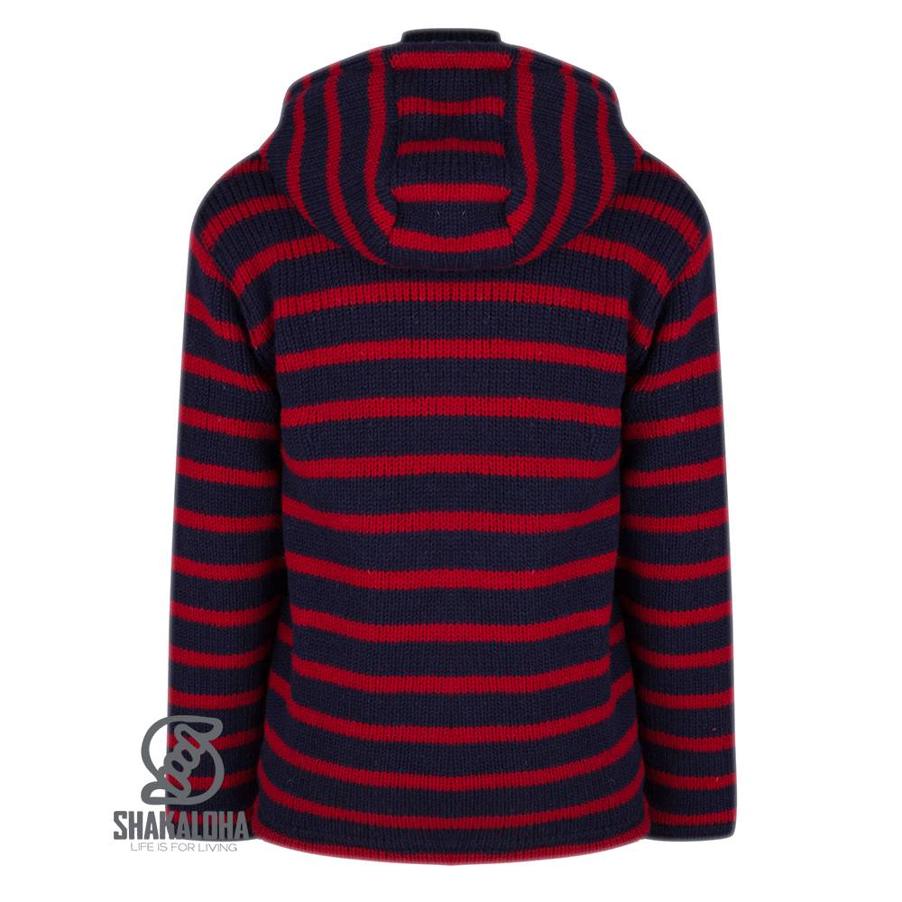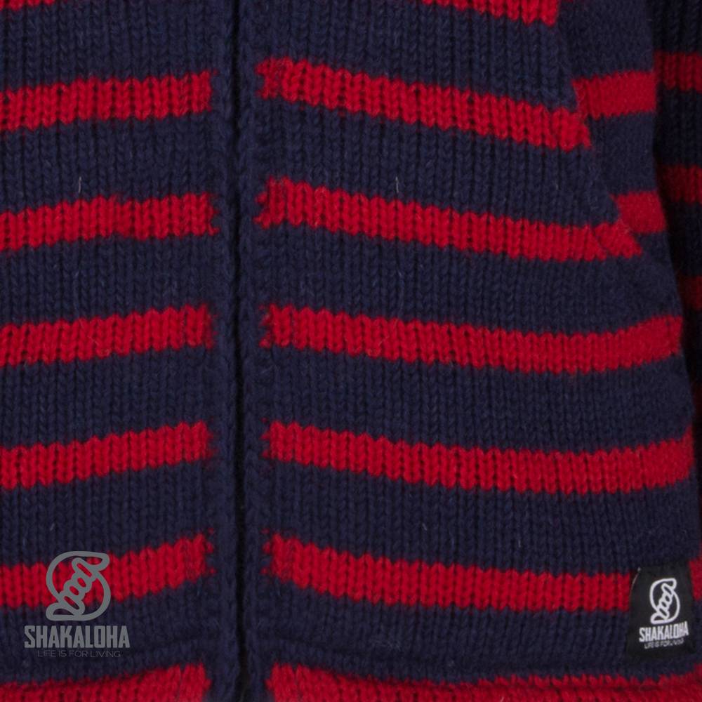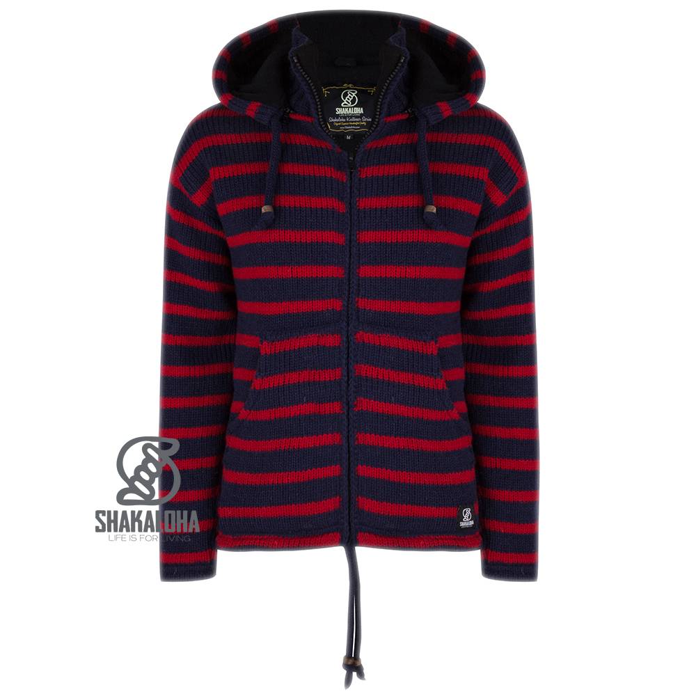 Este cálido y cómodo chaleco Shakaloha para hombre es azul marino con rayas horizontales rojas. Cuenta con bolsillos laterales, una resistente cremallera YKK y un bolsillo interior con cierre. La capucha es desmontable y está completamente forrado con suave forro polar, tanto en el cuerpo como en las mangas. Este cálido chaleco puede usarse como chaqueta en invierno, pero también es muy cómodo en los días frescos de verano. Disponible en varias combinaciones de colores y tallas de la S a la 3XL. Los chalecos Shakaloha están hechos 100 % con lana de oveja de Nueva Zelanda y se fabrican en Nepal respetando tanto a los animales como a los trabajadores. Se pueden lavar con un poco de detergente para lana en un ciclo de 30 grados.
