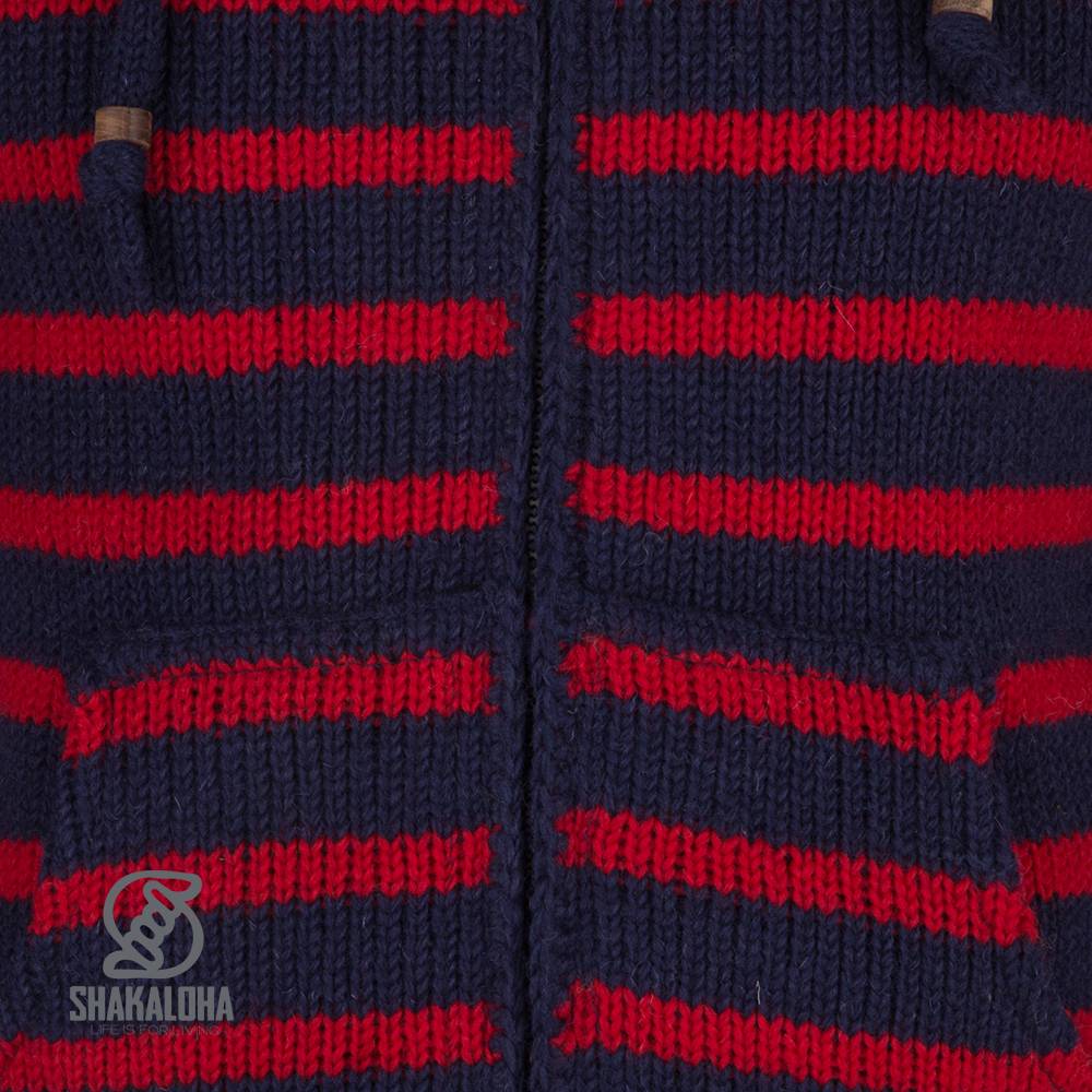 Descripción Chaleco de punto de lana Shakaloha con capucha dividida y cremallera, color azul marino y rojo, forro polar y capucha desmontable - Hombre/Unisex - Hecho a mano en Nepal con lana de oveja