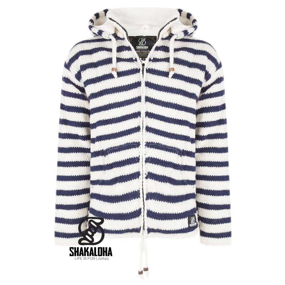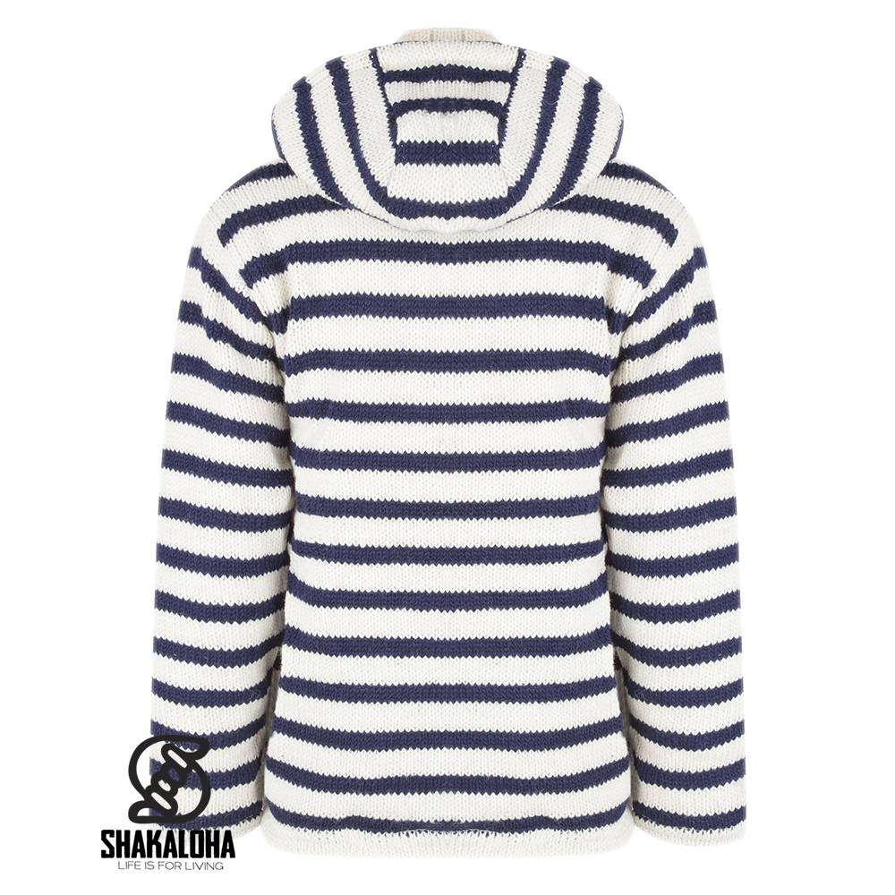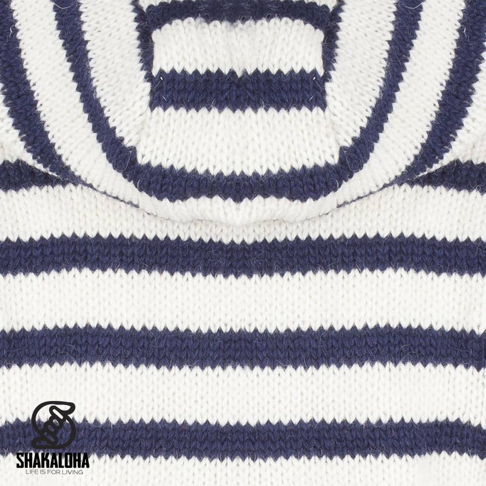Este cálido y cómodo chaleco Shakaloha para hombre es blanco con rayas horizontales azul marino. Cuenta con bolsillos laterales, una resistente cremallera YKK y un bolsillo interior con cierre. La capucha es desmontable y está completamente forrado con suave forro polar, tanto en el cuerpo como en las mangas. Este cálido chaleco puede usarse como chaqueta en invierno, pero también es muy cómodo en los días frescos de verano. Disponible en varias combinaciones de colores y tallas de la S a la 3XL. Los chalecos Shakaloha están hechos 100 % con lana de oveja de Nueva Zelanda y se fabrican en Nepal respetando tanto a los animales como a los trabajadores. Se pueden lavar con un poco de detergente para lana en un ciclo de 30 grados.