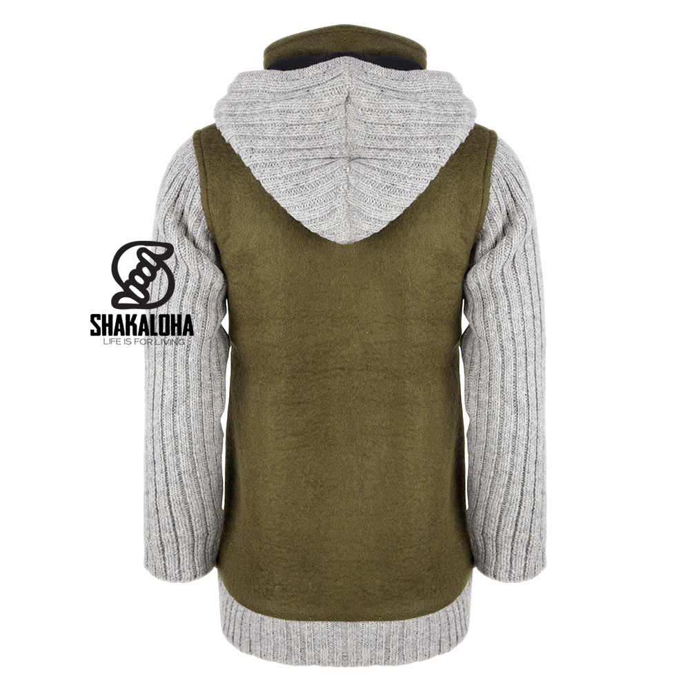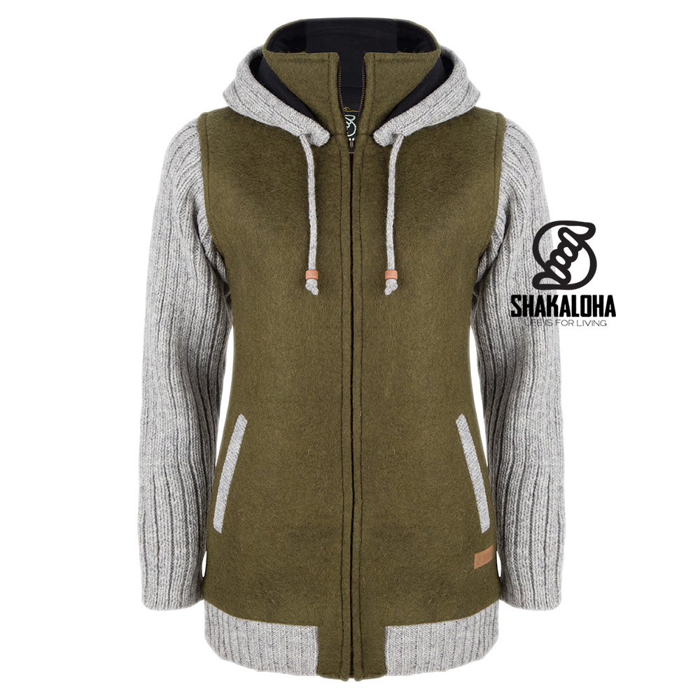 Chaqueta de béisbol única, confeccionada en fieltro verde oliva y punto grueso gris, íntegramente con 100 % lana de oveja. El cuerpo es de fieltro azul marino, y las mangas, el cuello y la capucha son grises y de punto grueso. *Bolsillos laterales *Cremalleras YKK *Bolsillo interior con cierre *Forro completo 100 % algodón *Capucha desmontable *Disponible en tallas S a XL Los chalecos Shakaloha están confeccionados con 100 % lana de oveja de Nueva Zelanda y se fabrican en Nepal respetando a los animales y a los trabajadores. Se pueden lavar con un poco de detergente para lana en un ciclo de 30 grados.