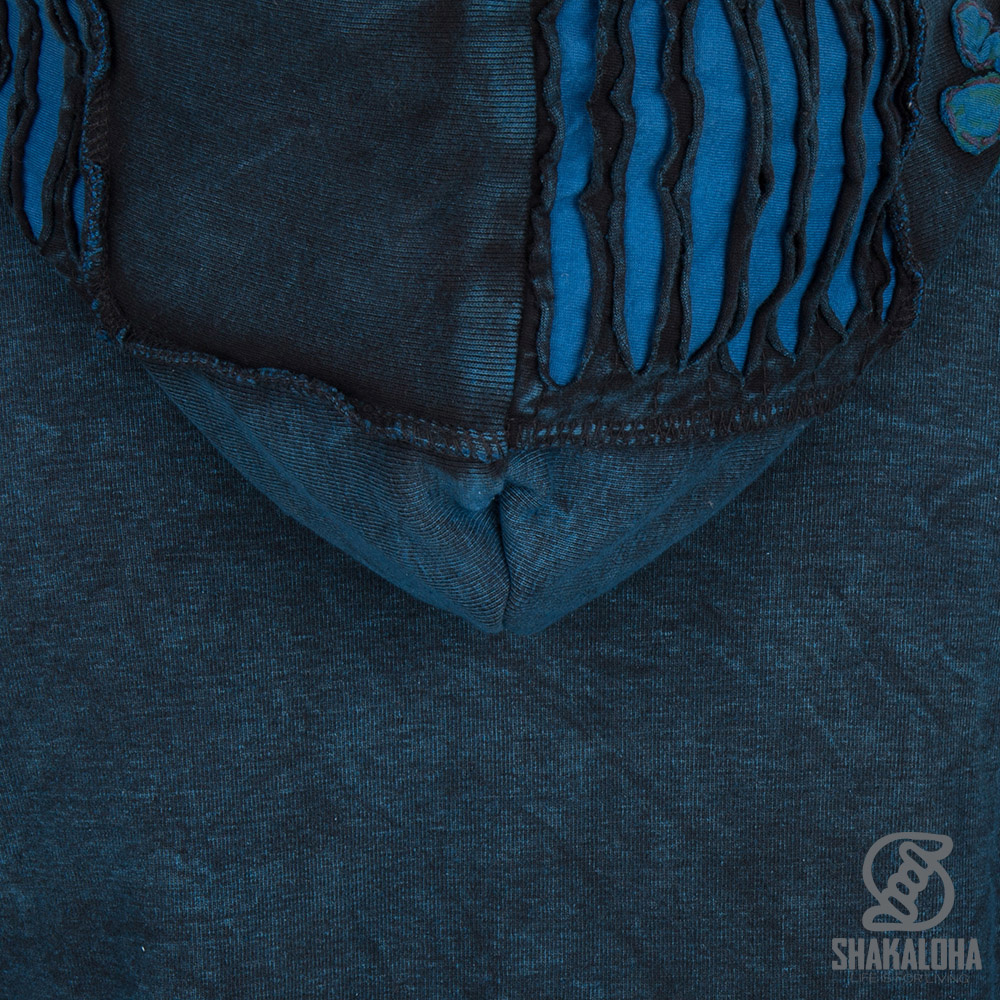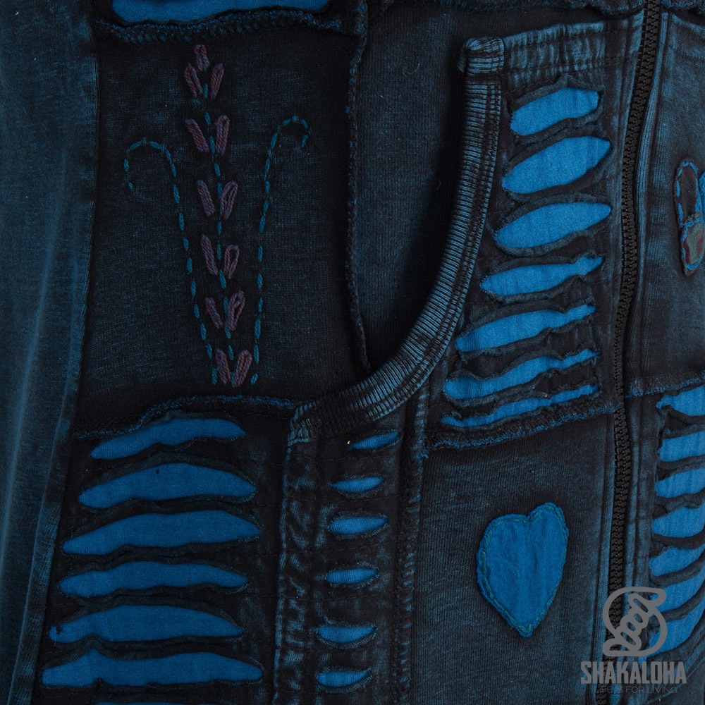 Una chaqueta Shakaloha color denim con alegres detalles florales y de corazones. Esta chaqueta llega por debajo de la cadera y está forrada con un suave forro polar ecológico. Cuenta con bolsillos laterales, una cremallera resistente y capucha. Esta chaqueta está disponible en muchas combinaciones de colores con diversos forros, desde la talla S hasta la 3XL, y está confeccionada en Nepal con respeto por el prójimo.