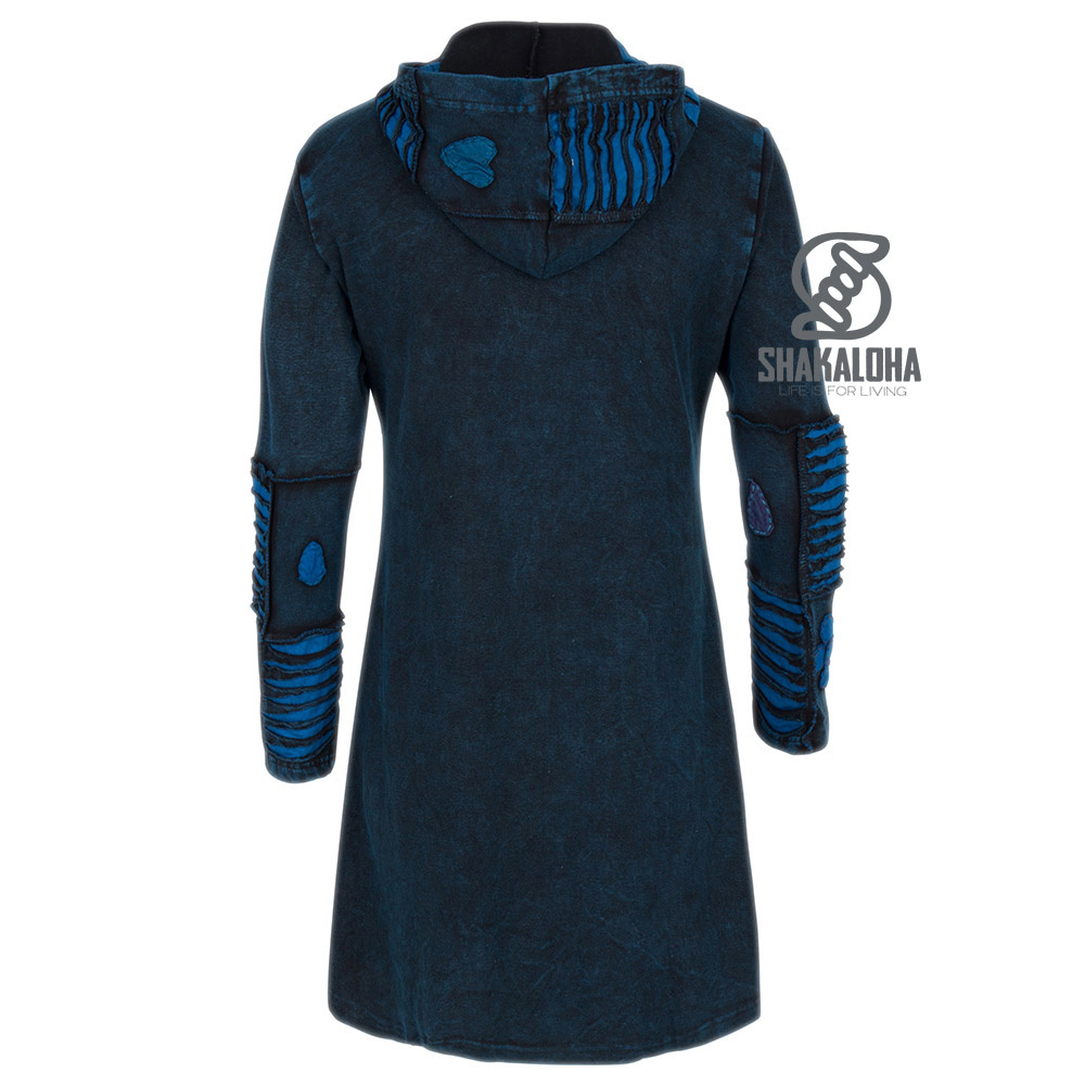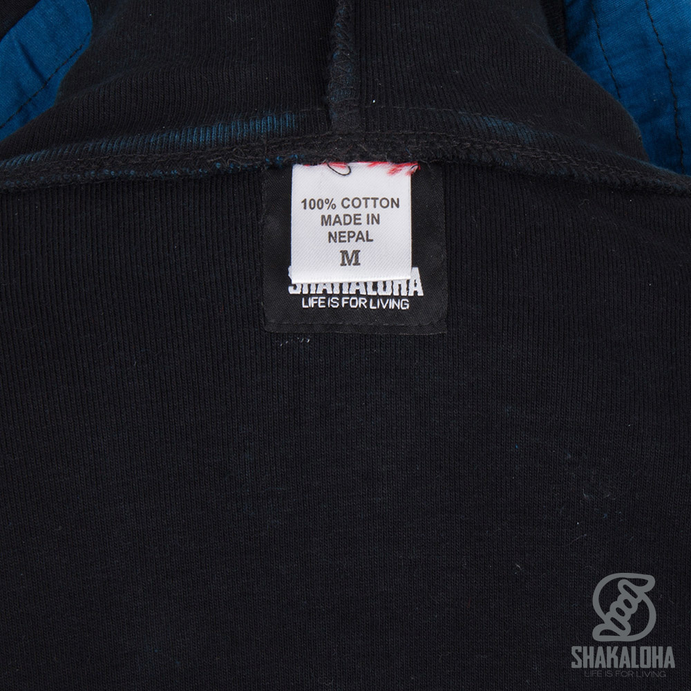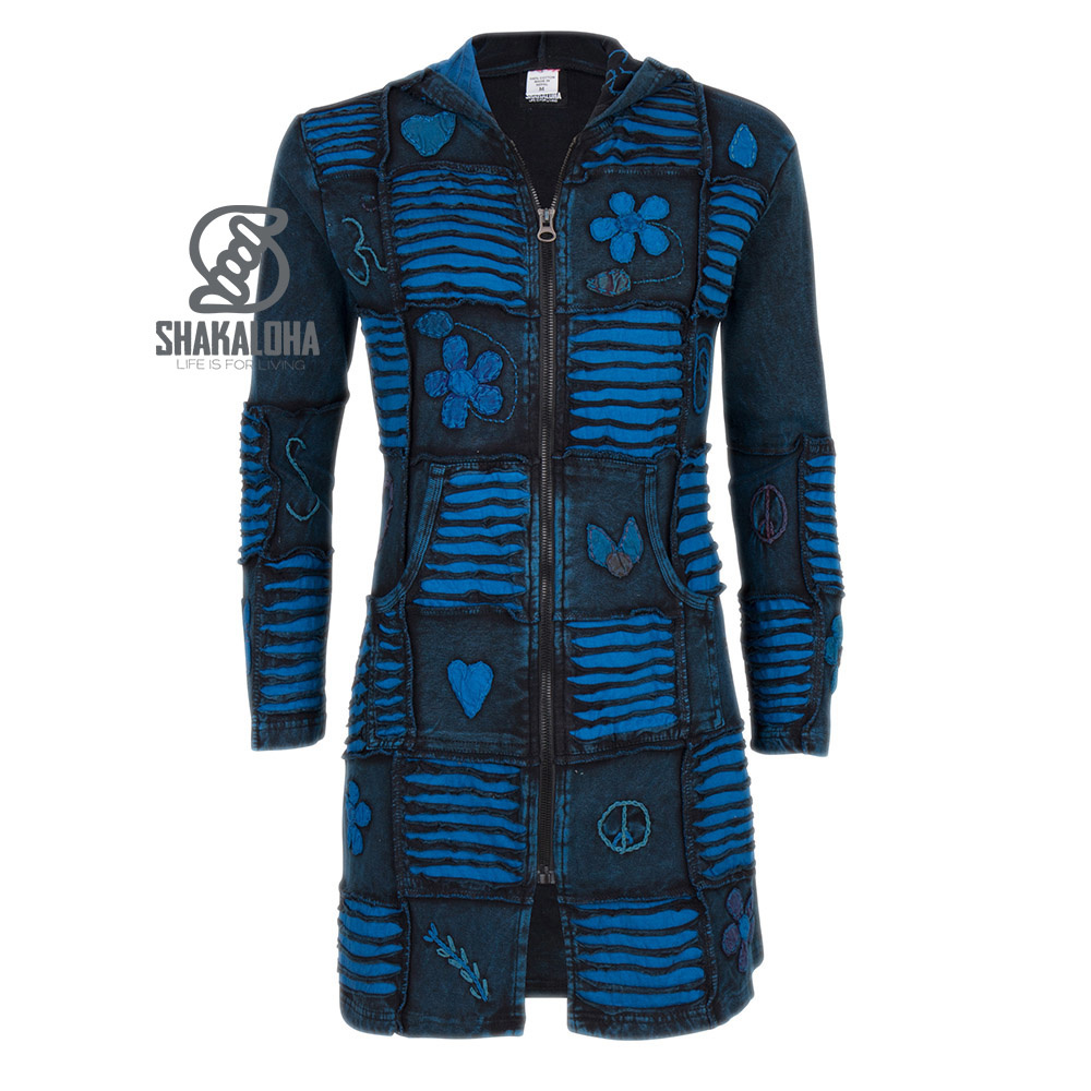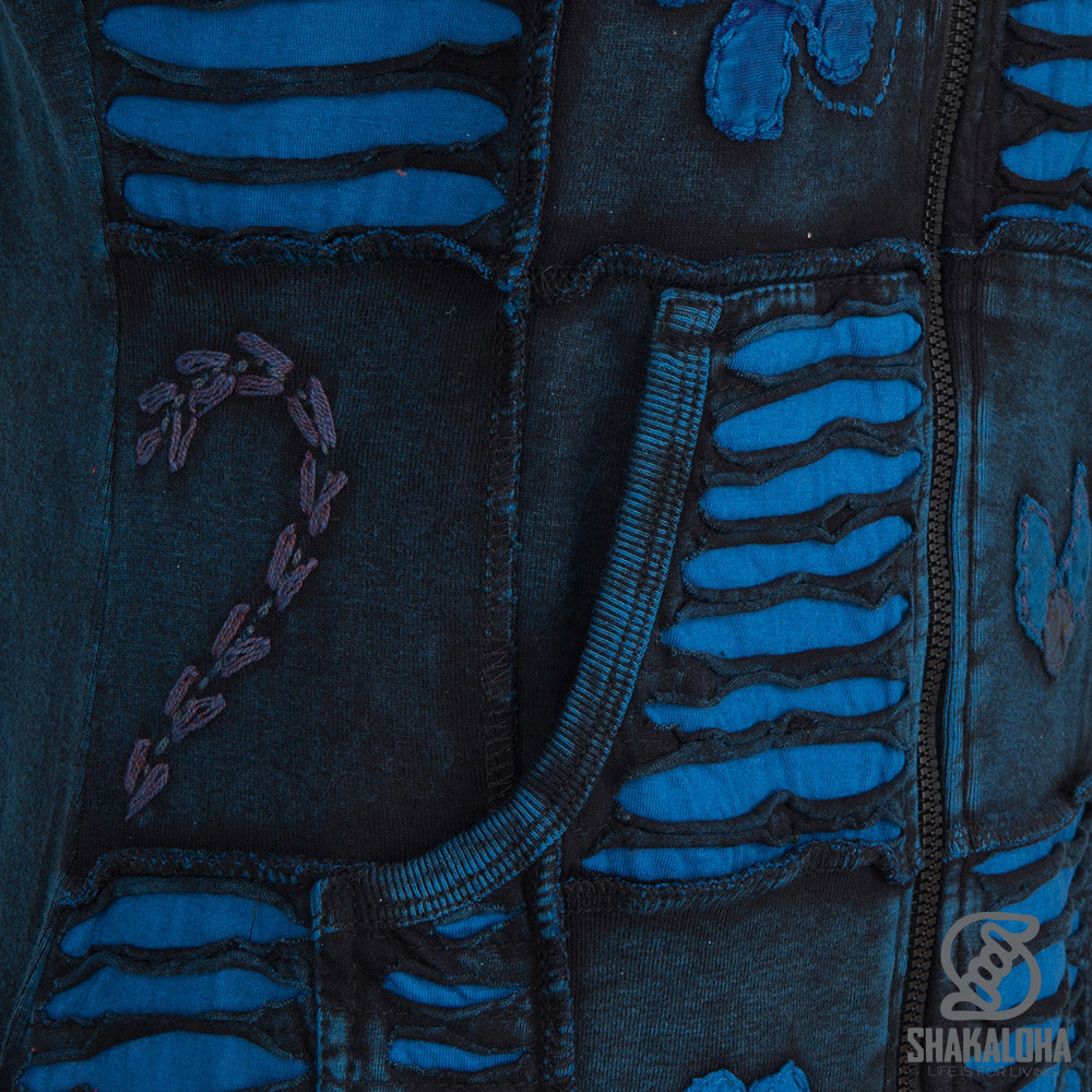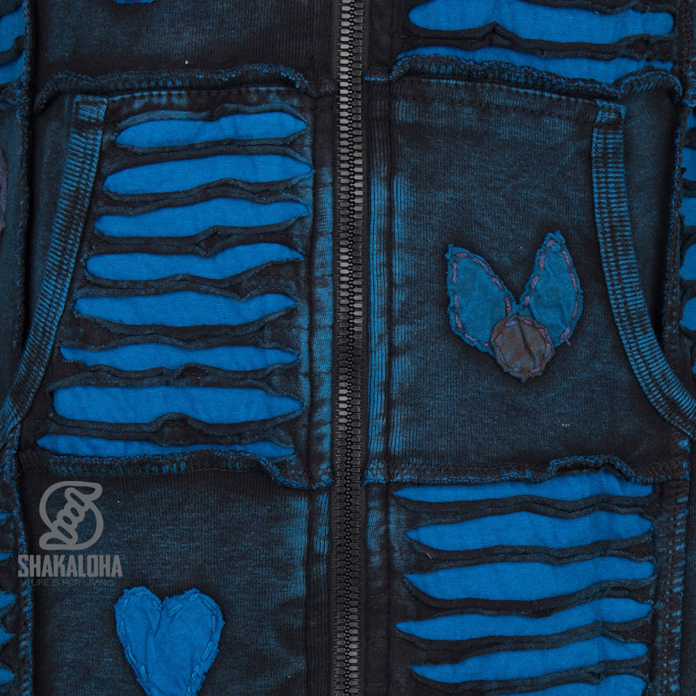 Chaqueta Shakaloha azul vaquero con divertidos detalles en azul medio con flores y corazones. Esta chaqueta llega por debajo de la cadera y no tiene forro. Tiene bolsillos laterales, una cremallera resistente y capucha. Hecha en Nepal con respeto por las personas y los animales.