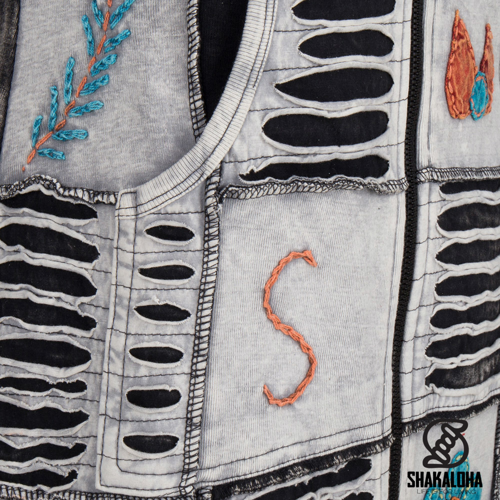 Chaqueta Shakaloha beige y antracita con alegres detalles florales y de corazones. Esta chaqueta llega por debajo de la cadera y no tiene forro. Tiene bolsillos laterales, una cremallera resistente y capucha. Todos los productos Shakaloha se fabrican respetando tanto a las personas como a los animales.