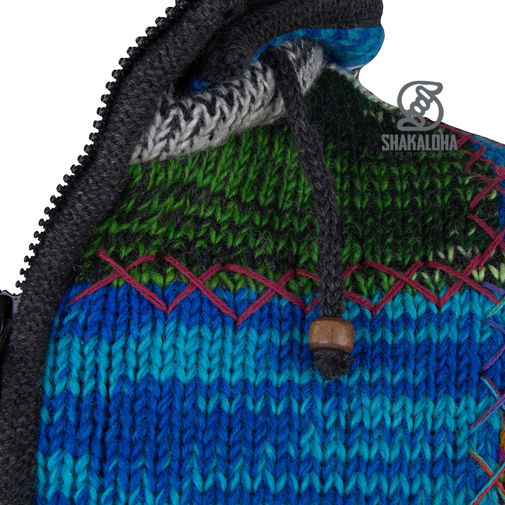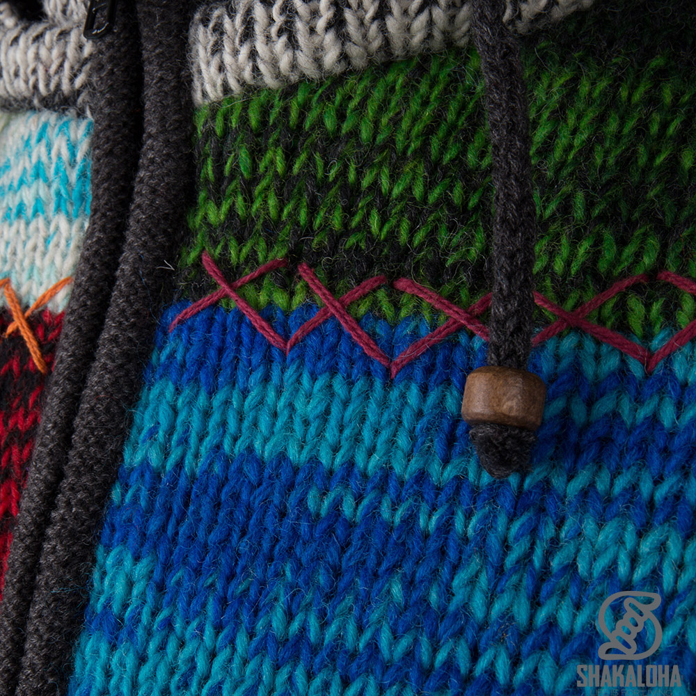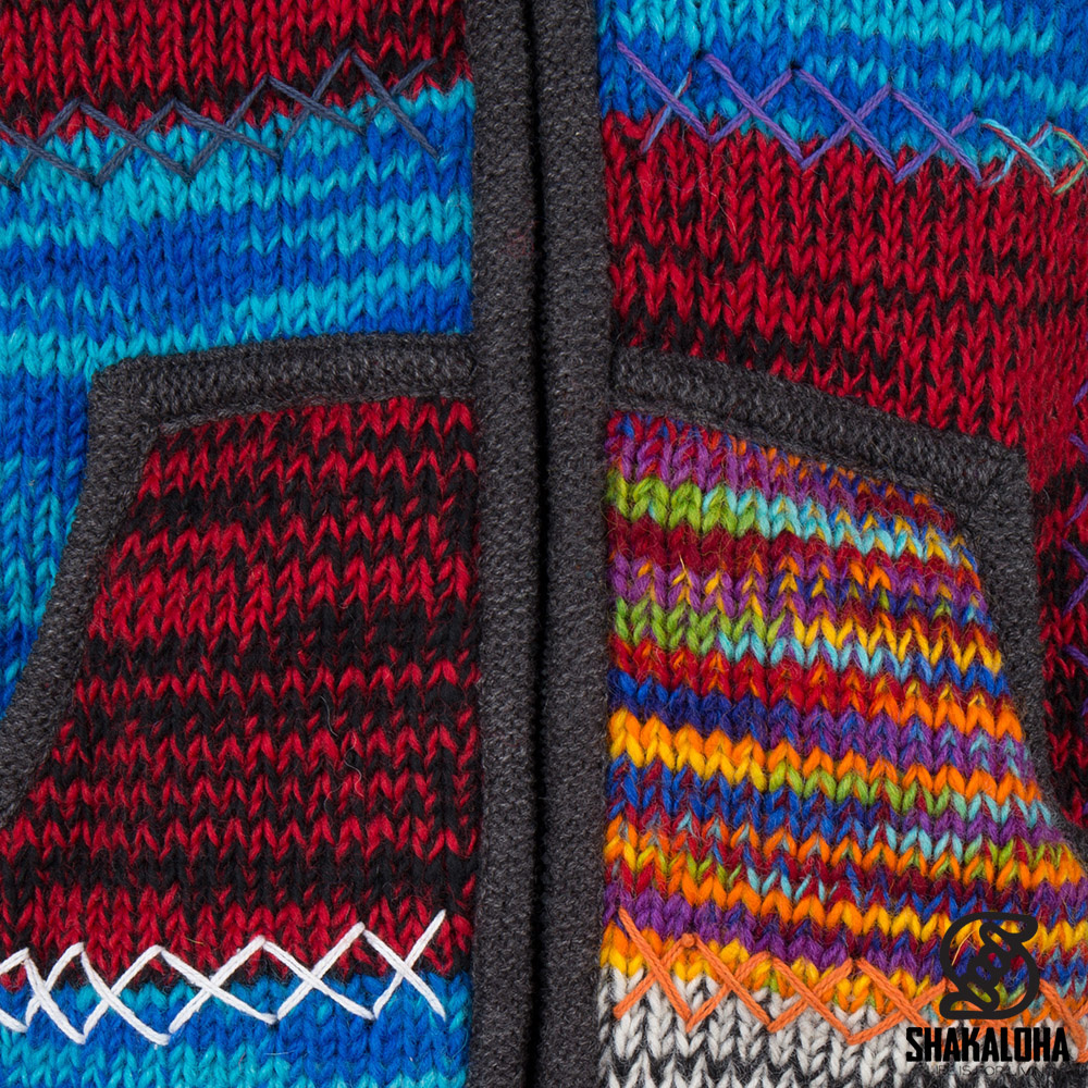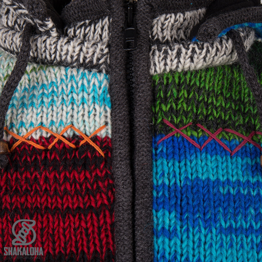 Este colorido cárdigan presenta paneles en varios colores. Algunos son naturales, mientras que otros incluyen tonos de azul, verde y rojo. A pesar de la amplia variedad de colores, el efecto general es sereno. Este cárdigan único presenta un punto de cruz hecho a mano entre los paneles, bolsillos laterales, un bolsillo interior con cierre y una capucha desmontable con cremallera, todo ello forrado con un suave y cálido forro polar para una comodidad óptima. Este cárdigan de patchwork está disponible en muchas combinaciones de colores y en tallas de la S a la 3XL. Los cárdigans Shakaloha están hechos 100 % con lana de oveja de Nueva Zelanda y se fabrican en Nepal respetando tanto a los animales como a los trabajadores. Se pueden lavar con un poco de detergente para lana en un ciclo de 30 grados.