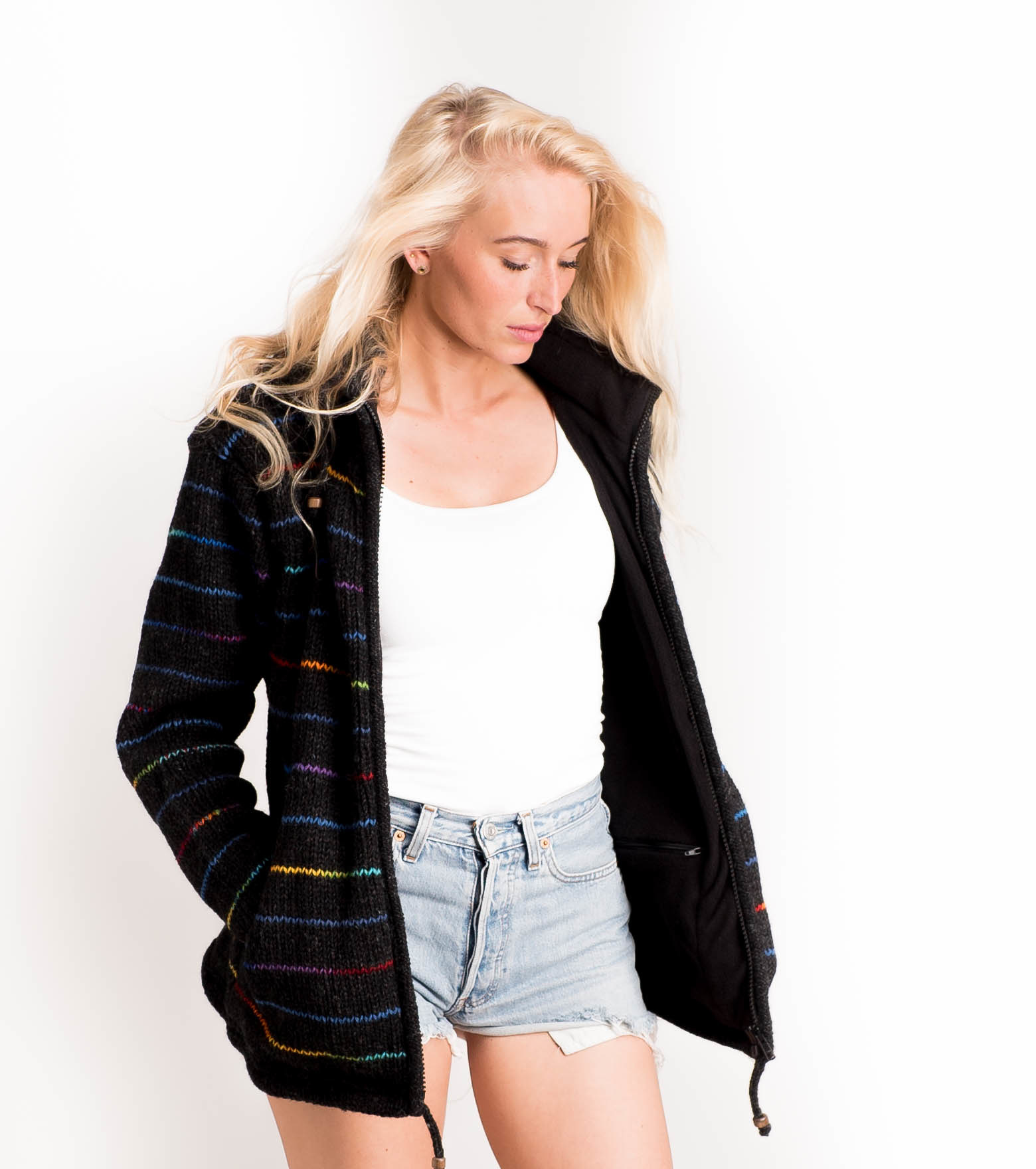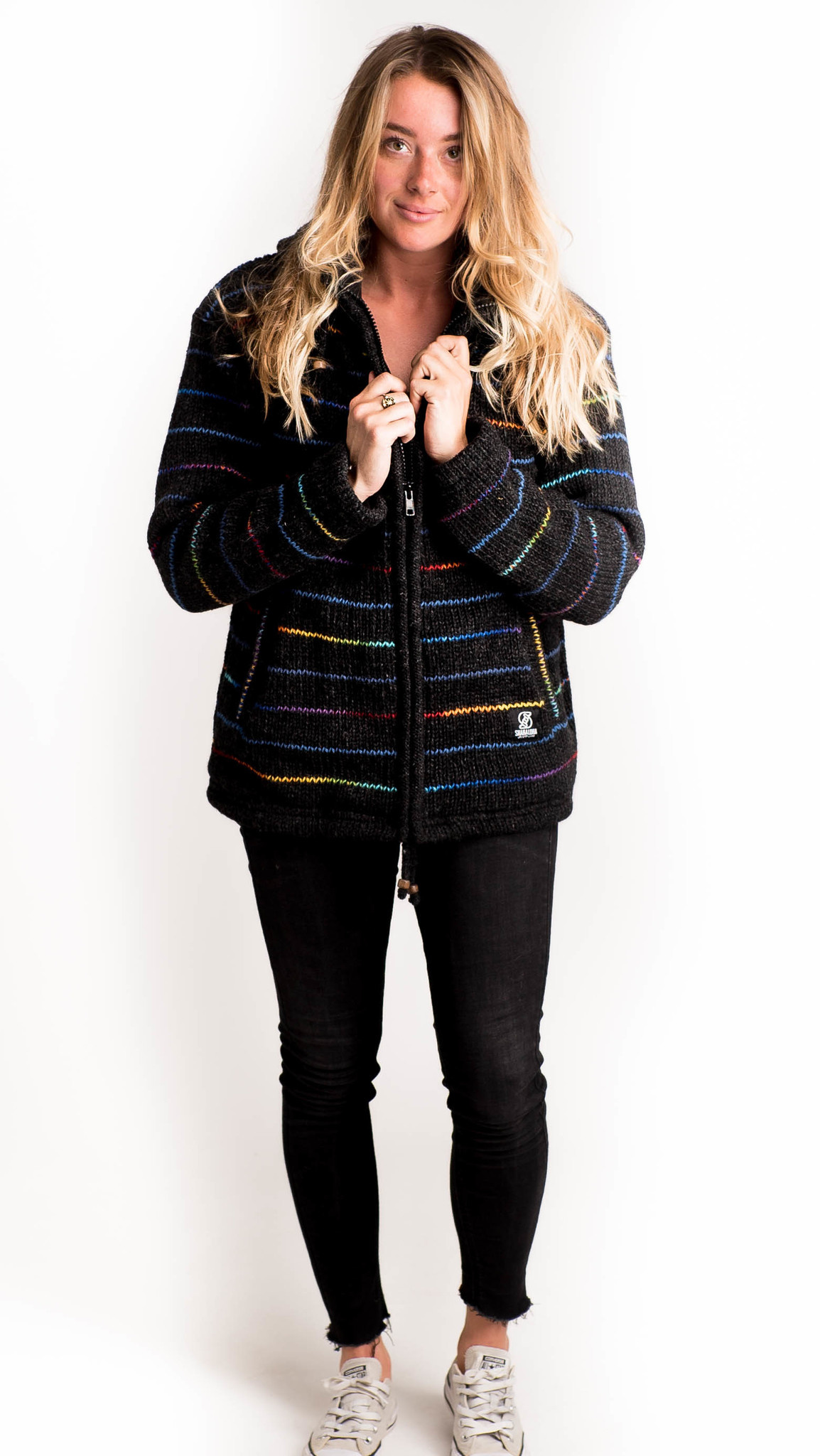 Este chaleco, predominantemente gris antracita, presenta rayas horizontales de colores brillantes y está completamente forrado con un cálido forro polar en el cuerpo, las mangas, el cuello, la capucha, los bolsillos laterales y el bolsillo interior, lo que evita que roce la piel. La capucha es fija y las cremalleras son YKK, lo que las hace increíblemente duraderas. Este chaleco, increíblemente cálido, puede usarse como chaqueta en invierno, pero también es muy cómodo en los días frescos de verano. Disponible en tallas de la S a la XXL y en antracita con rayas más sutiles. Los chalecos Shakaloha están hechos 100 % de lana de oveja de Nueva Zelanda y se fabrican en Nepal respetando tanto a los animales como a los trabajadores. Se pueden lavar con un poco de detergente para lana en un ciclo de 30 grados.