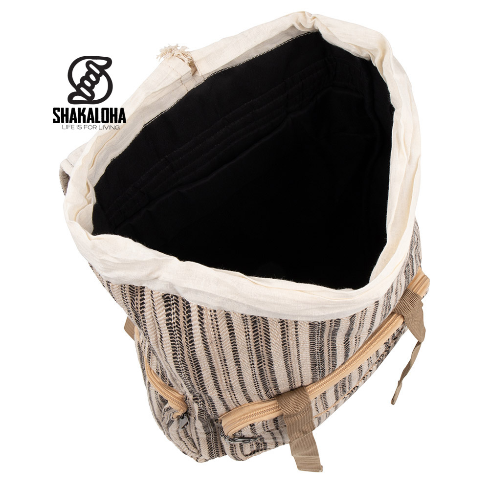 Sac à dos Shakaloha de taille moyenne en coton. Sac à dos avec plusieurs compartiments à fermeture éclair et espace pour un ordinateur portable de 15 pouces. Le haut peut être fermé avec un cordon et des bretelles. Remarque : ce sac à dos est disponible en différents motifs à rayures.