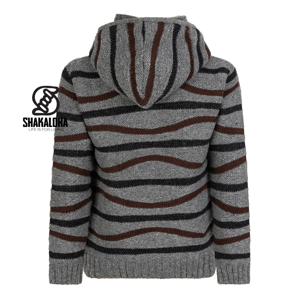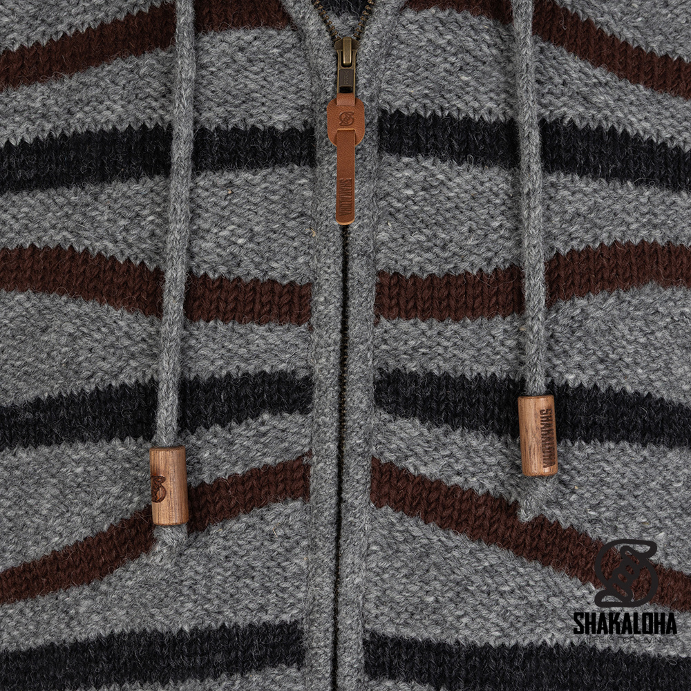 Extérieur : laine de mouton tricotée mainDoublure polaire intégraleZip frontal YKKCapuche amovible avec cordons et embouts en bois2 pochesBords‐côtes, coupe regularCouleur : GrisFait main au NépalEntretien : programme laine à froid (max 30°C) ; séchage à plat.