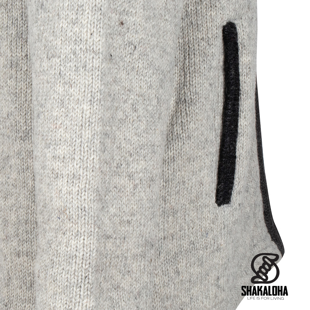 Gilet pour homme Shakaloha gris avec des accents gris anthracite et une capuche amovible, des poches latérales, une doublure en polaire douce, une poche zippée au-dessus de la poitrine et une poche intérieure refermable. Les accents gris anthracite se retrouvent au niveau des poches, de la fermeture éclair, d'une poche gris foncé sur le bras et d'une bande sur la capuche. Le cardigan est disponible dans de nombreuses combinaisons de couleurs et dans les tailles S à 3XL. Les gilets Shakaloha sont fabriqués à 100% en laine de mouton de Nouvelle-Zélande et sont fabriqués au Népal dans le respect des animaux et des employés. Les gilets peuvent être lavés avec un peu de détergent pour laine sur un programme de lavage de laine à 30 degrés.
