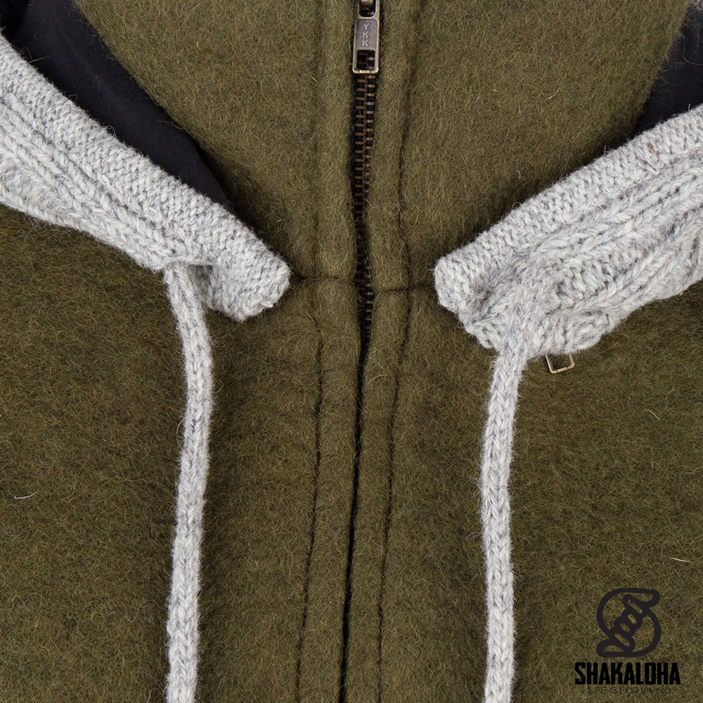 Description Shakaloha Veste en Laine Tricoté Baseball ZH Couleur olive avec Doublure en coton et Capuche détachable - Femmes - Fabriqué à la main au Népal en laine de mouton