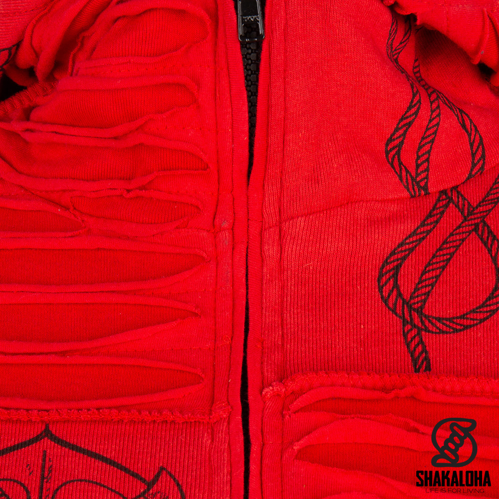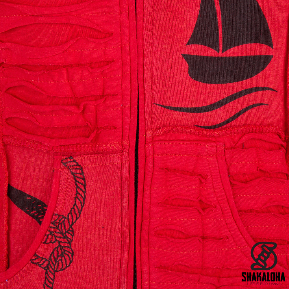 Une ravissante veste rouge en coton pour femme, ornée d'un motif marin avec des nœuds marins noirs, des ancres, des bateaux, des mouettes et des vagues. Entièrement doublée de polaire douce et chaude, elle possède deux poches latérales, une capuche et une fermeture éclair robuste.