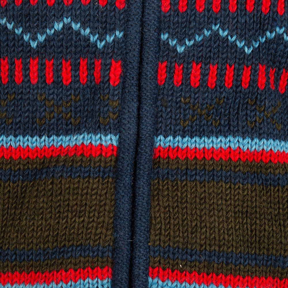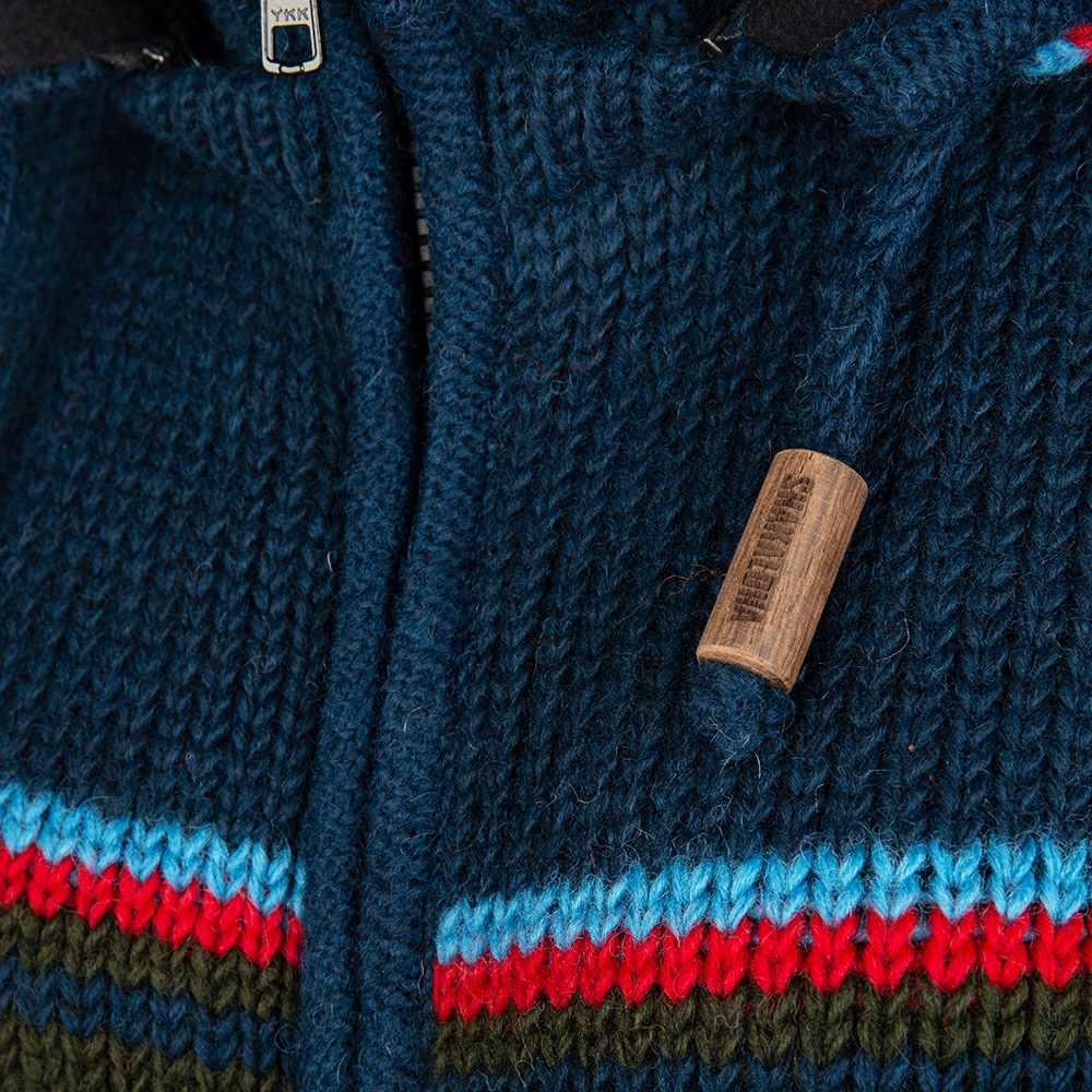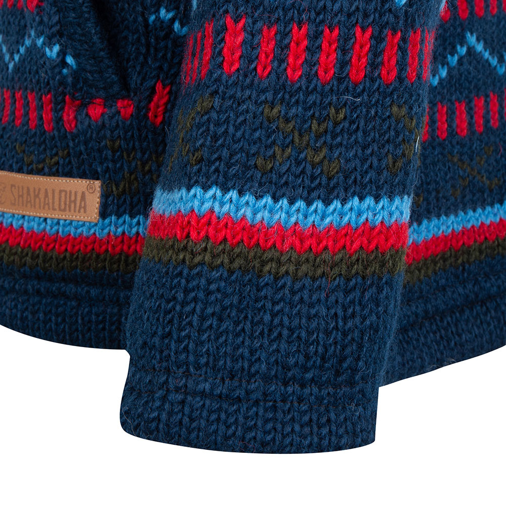 Cardigan femme Shakaloha en laine avec imprimé norvégien dans les couleurs bleu pétrole, vert olive, rouge et bleu clair. La veste est bien chaudement doublée de polaire et possède une capuche amovible, des poches latérales et une poche intérieure avec fermeture éclair. La veste est disponible en différentes couleurs et tailles. Les gilets Shakaloha sont composés à 100% de laine de mouton de Nouvelle-Zélande et sont fabriqués au Népal dans le respect des animaux et des employés. Les cardigans peuvent être lavés avec un peu de détergent pour laine sur un programme de lavage de laine à 30 degrés.