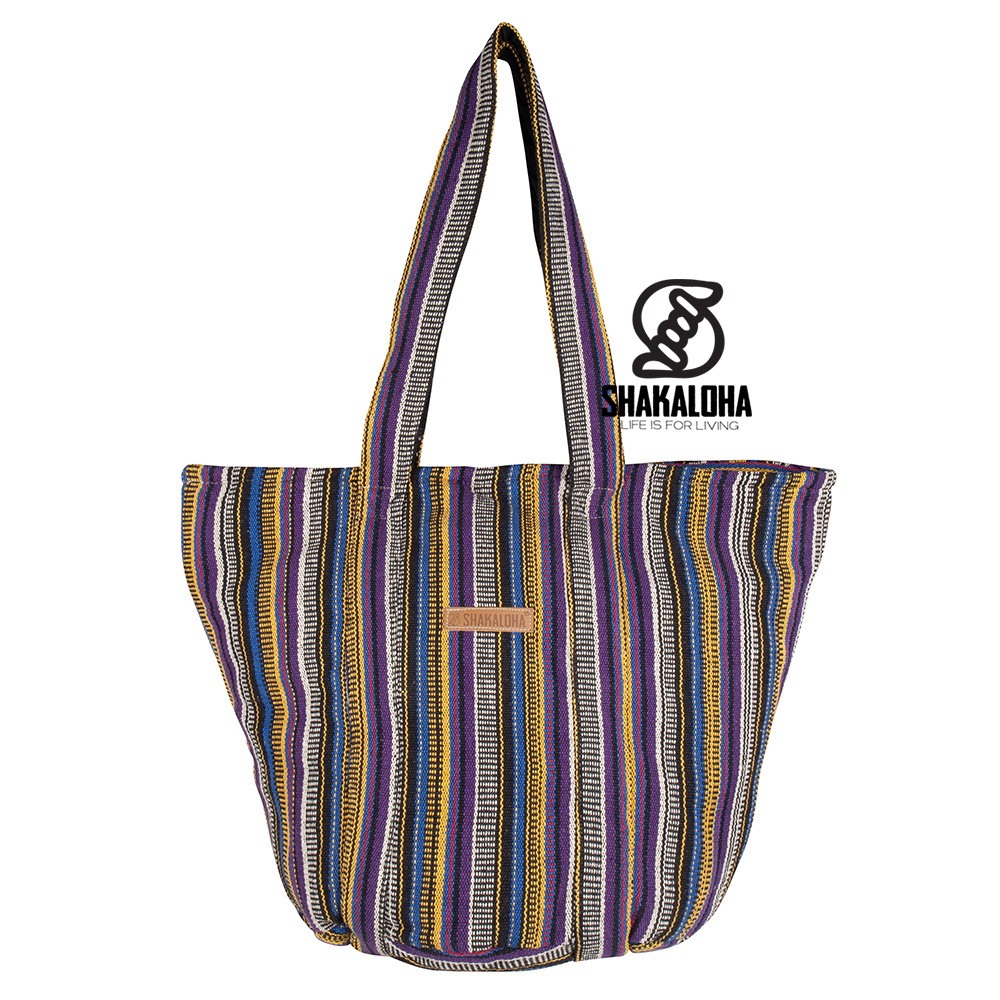 Borsa da spiaggia in cotone in stile bohémien con righe verticali multicolori in viola, giallo, blu e nero, foderata in cotone nero e dotata di una tasca interna. Il materiale si chiama "Nepali gherry" ed è tessuto localmente in piccole fabbriche in Nepal, interamente a mano. Il codice colore di questa borsa è AA07. Questa borsa accattivante e alla moda si chiude con una cerniera che corre lungo tutta la larghezza della parte superiore.