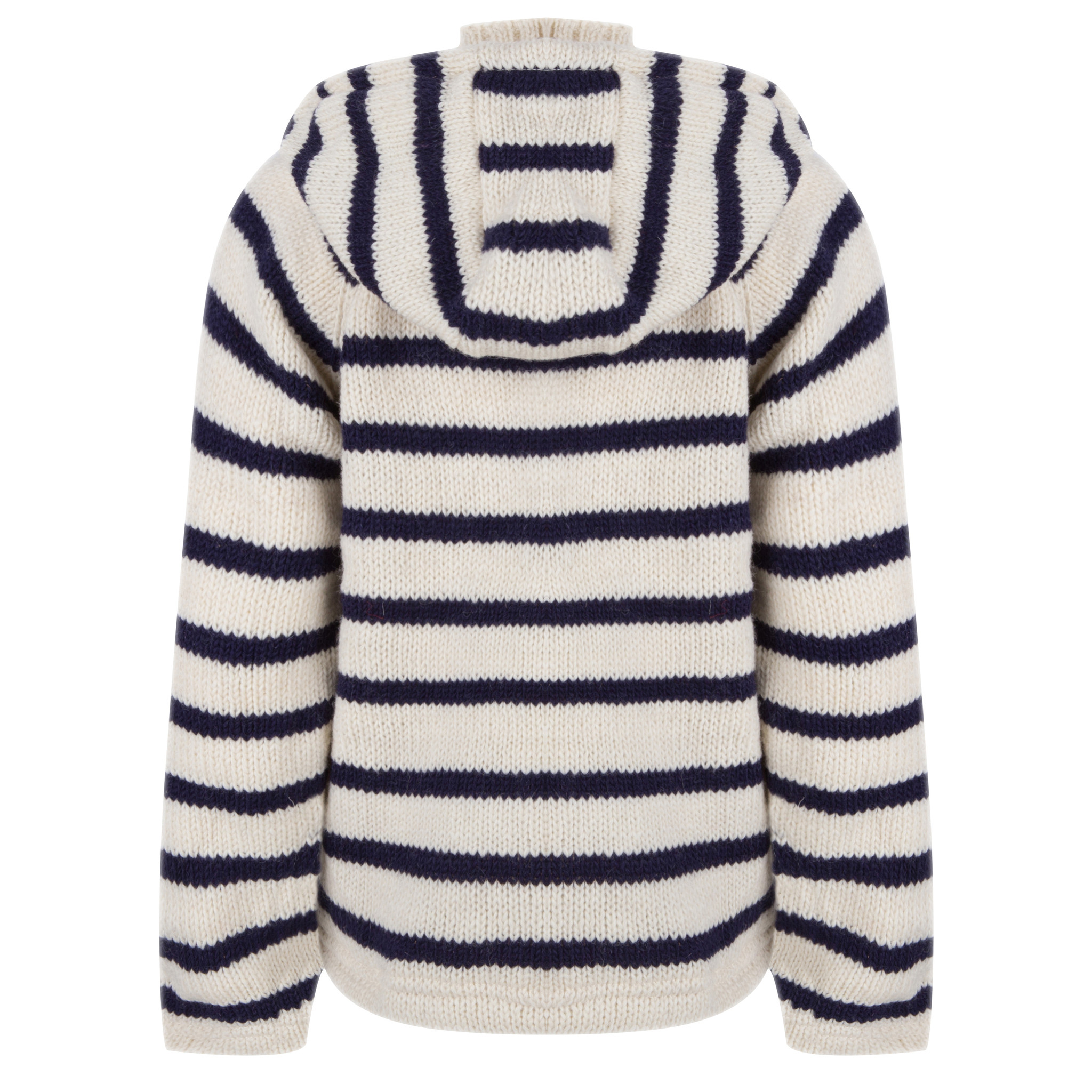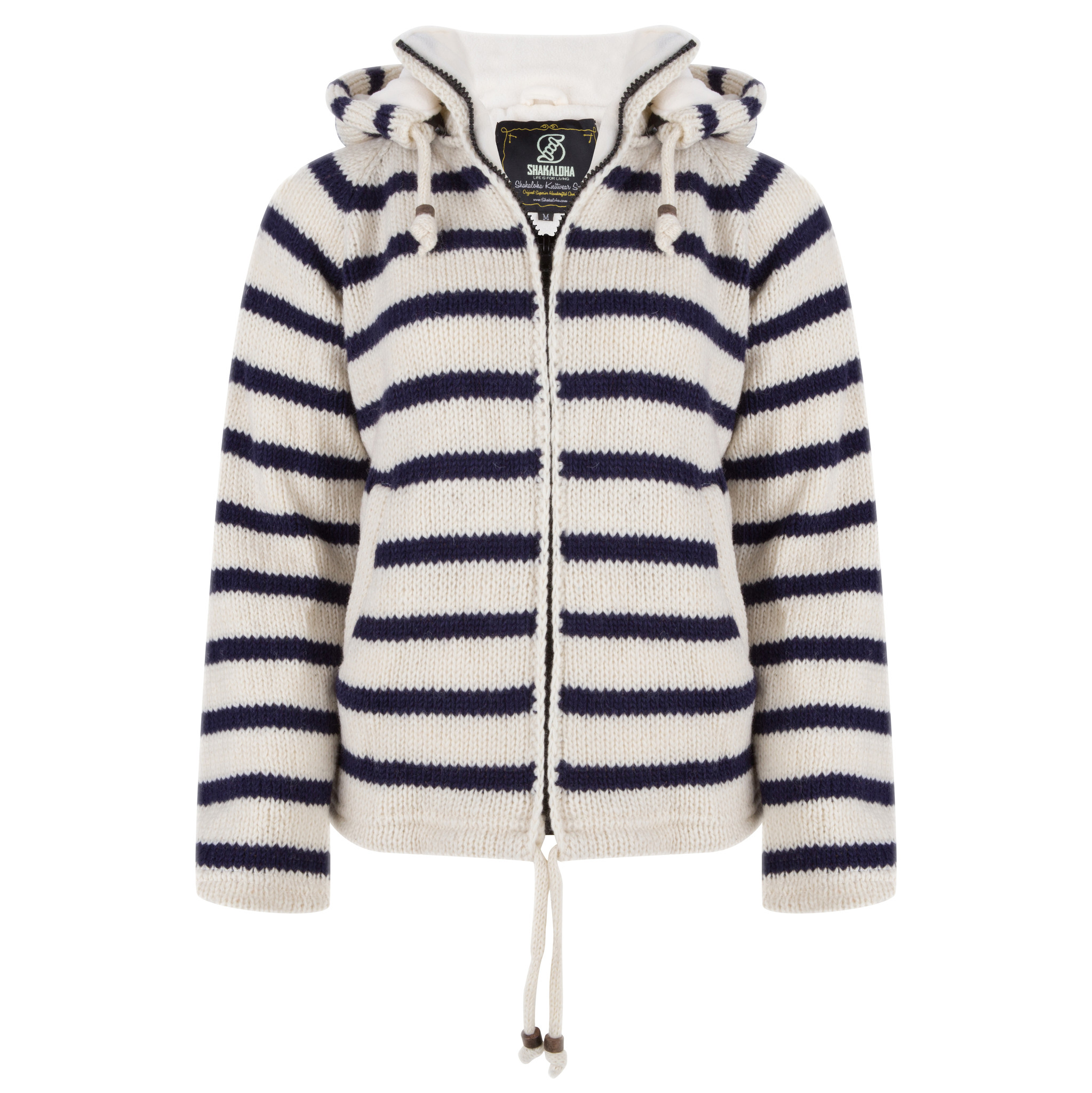 Cardigan in lana lavorato a maglia Shakaloha Breton con cerniera, bianco blu navy, fodera in pile e cappuccio staccabile - Donna - Fatto a mano in Nepal con lana di pecora - Copia
