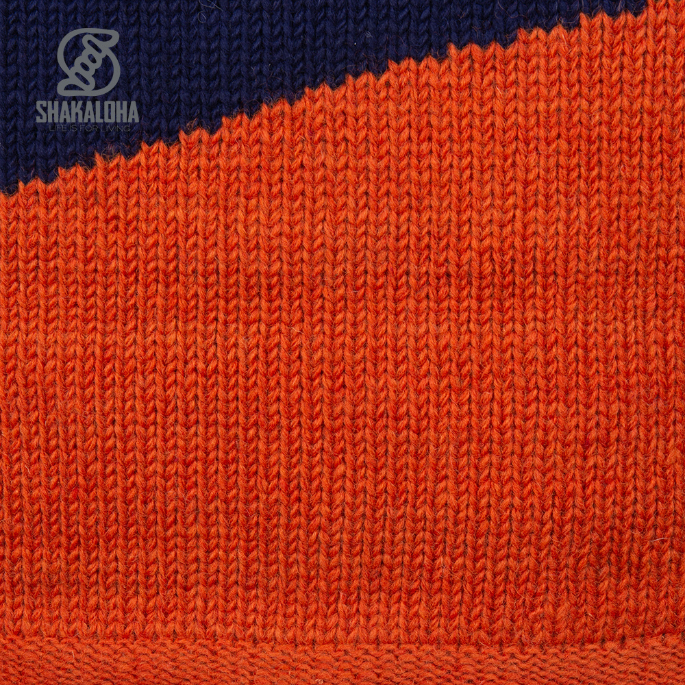Cardigan Shakaloha in lana lavorata a maglia con tre strisce diagonali in grigio, blu e arancione. Il cappuccio è metà nero e metà beige ed è staccabile con coulisse e un fermaglio Shakaloha in legno. Il cardigan ha tasche laterali e una tasca interna chiudibile ed è completamente foderato in caldo e morbido pile.