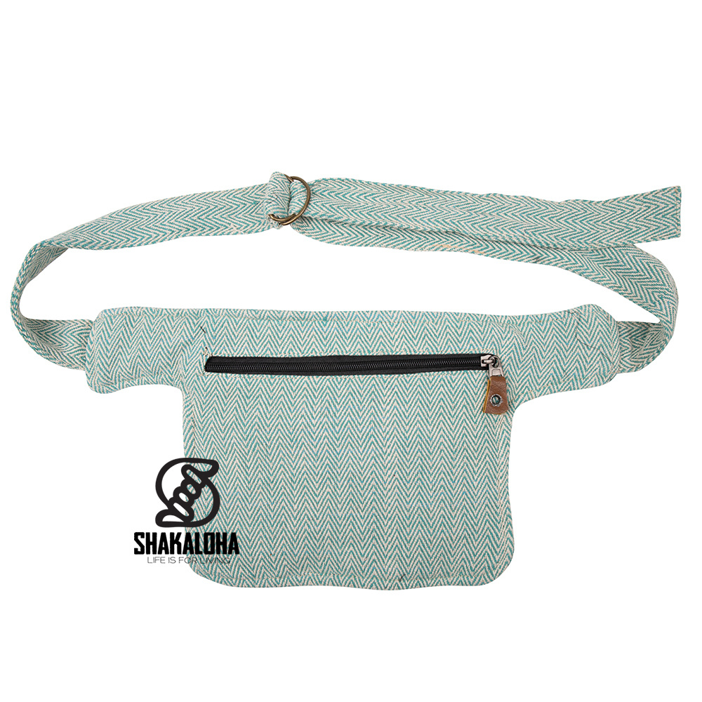Esclusivo marsupio Shakaloha con cerniere anteriori e posteriori in un motivo a zigzag verde menta/beige. Realizzato in cotone e canapa. Ideale per festival, viaggi ed escursioni.