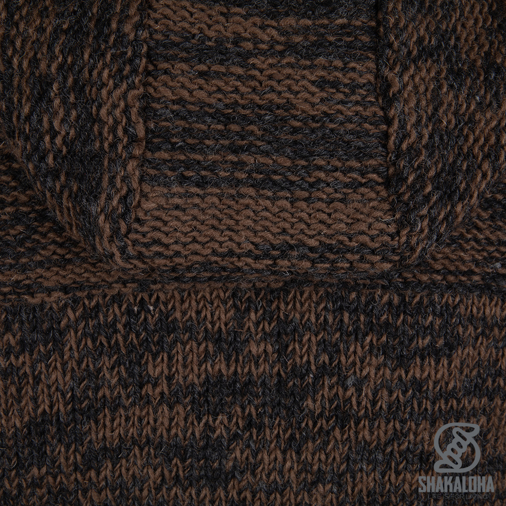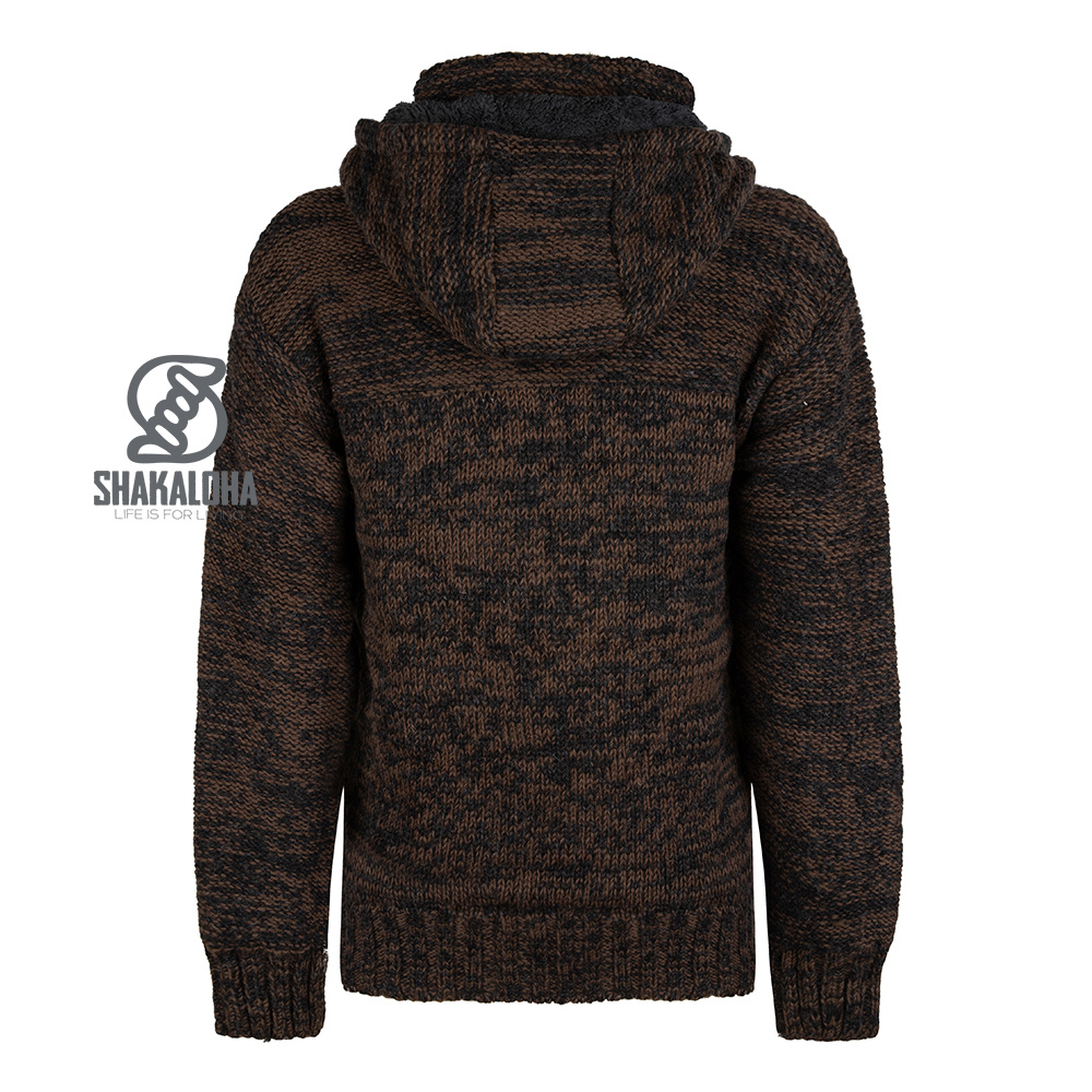 Cardigan da uomo in lana con fodera in pile teddy. Questo cardigan in lana extra caldo ha un cappuccio staccabile. Lavorato a maglia con un mix di lana grigio scuro e marrone scuro. Questo classico cardigan da uomo senza tempo presenta una tasca interna con cerniera e tasche a fessura foderate in pile teddy sul davanti.