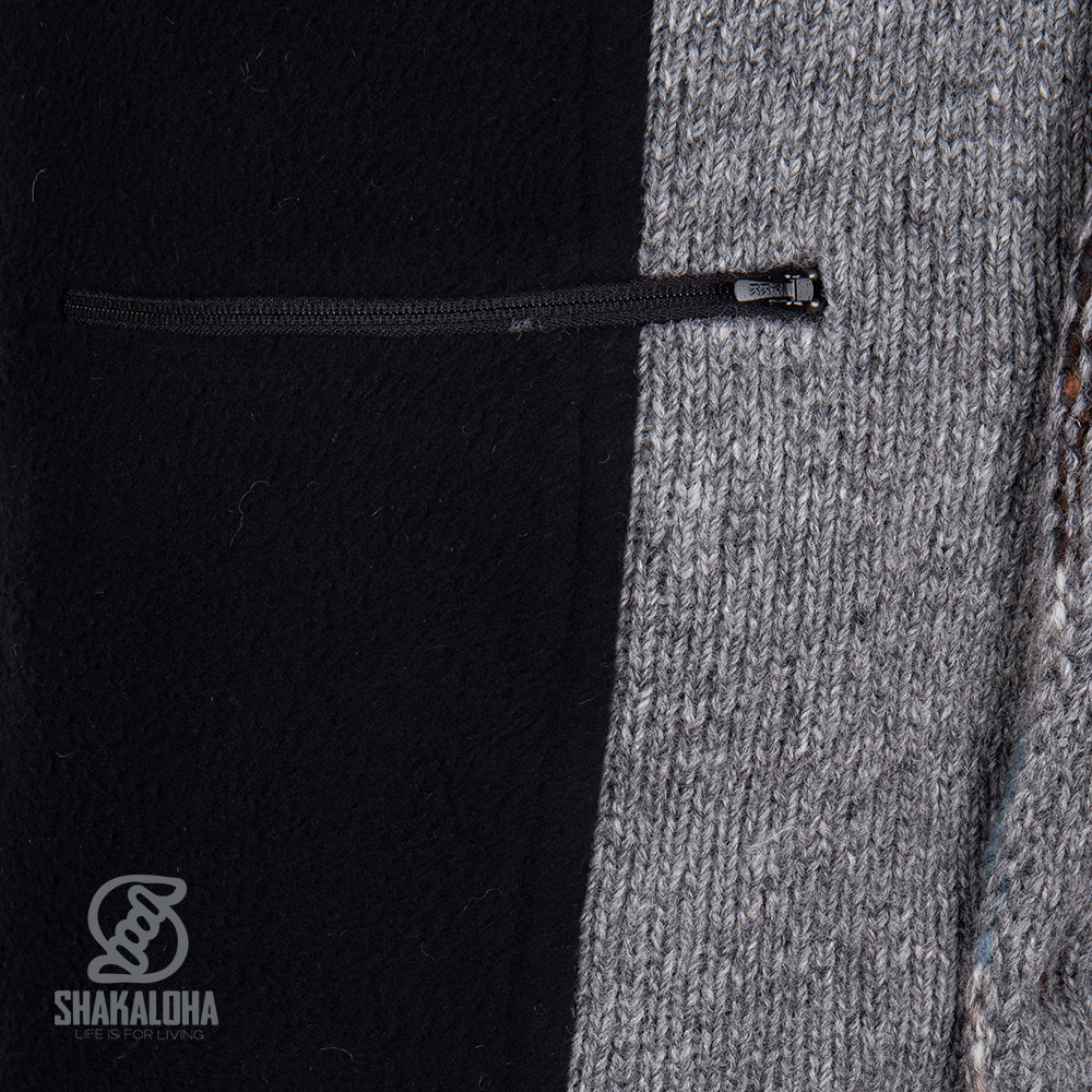 Giacca in lana foderata in pile, in stile blazer, con stampa sudamericana. Righe verticali in grigio chiaro, antracite e marrone. Il gilet ha tasche laterali, una tasca interna e gli esclusivi bottoni Shakaloha.