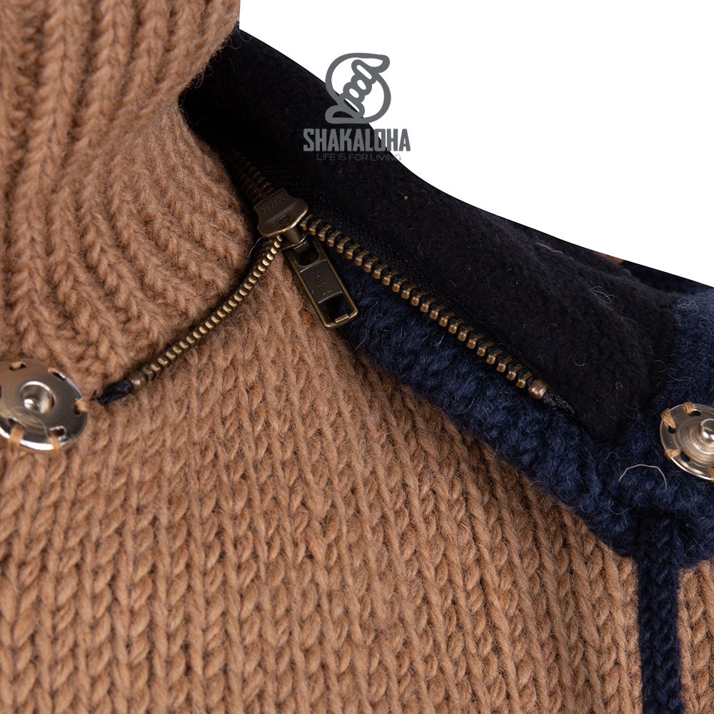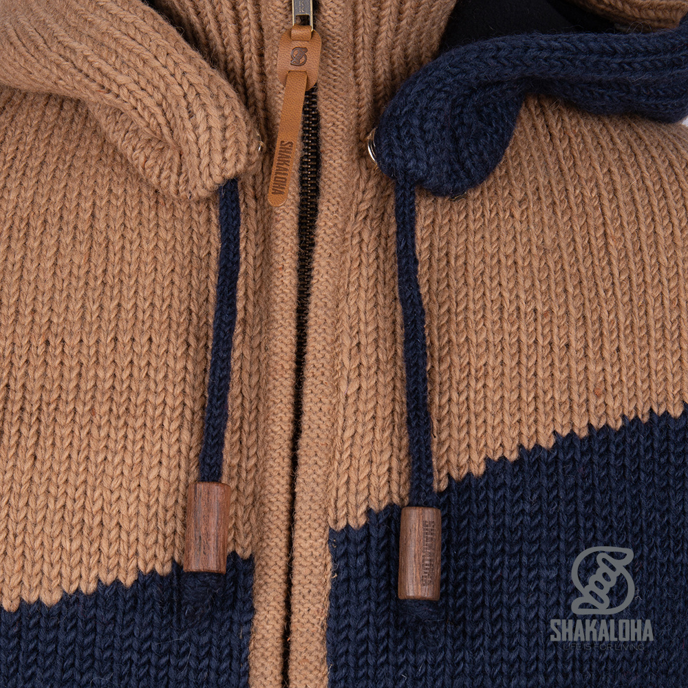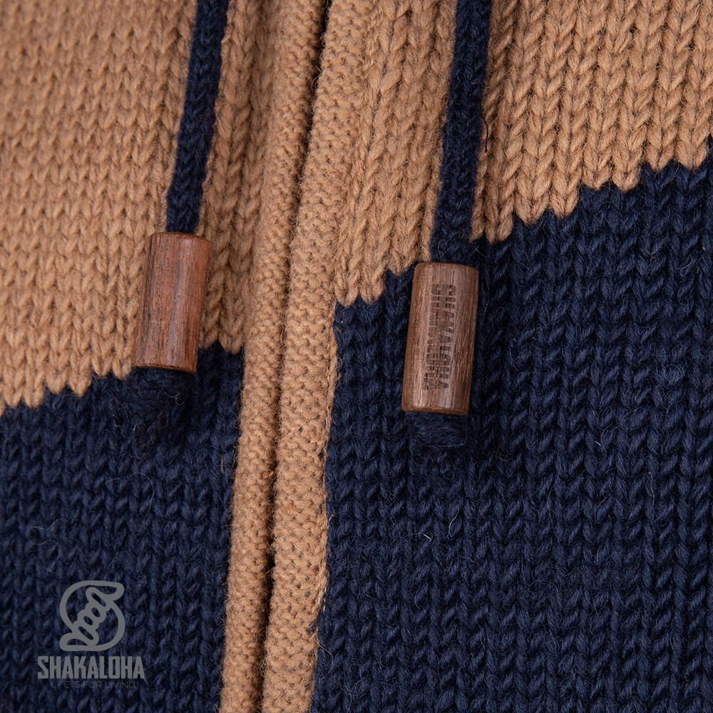 Cardigan Shakaloha in lana lavorata a maglia con tre strisce diagonali nei colori beige, blu e rosso. Il cappuccio è metà nero e metà beige ed è staccabile con coulisse e un fermaglio Shakaloha in legno. Il cardigan ha tasche laterali e una tasca interna chiudibile ed è completamente foderato in caldo e morbido pile.