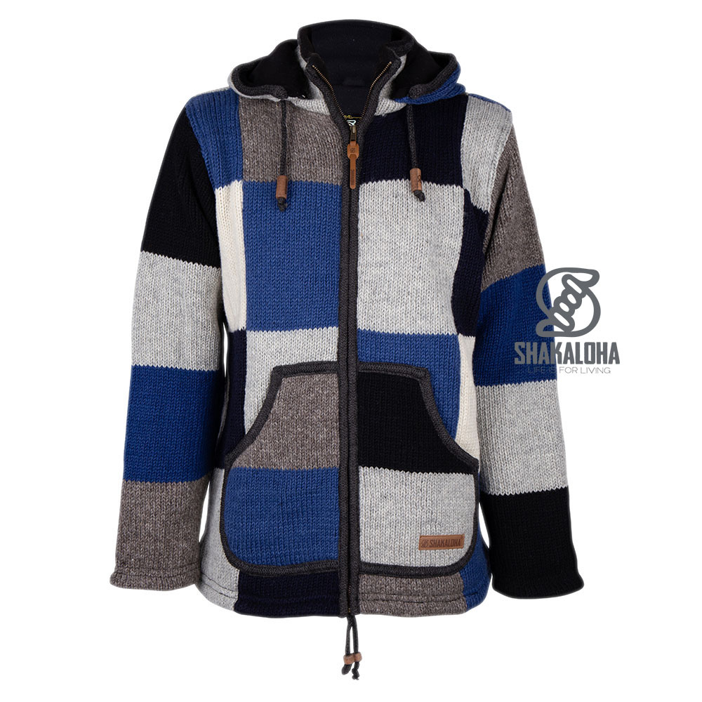 Cardigan da uomo in maglia patchwork a quadri blu con dettagli in grigio, nero e bianco. Completamente foderato in pile, con cappuccio staccabile e tasche a marsupio foderate. Una giacca per tutte le stagioni.